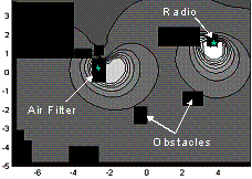 Noise Contour MapsThe robot is now able to identify three pieces of information about the auditory scene. It can identify source location, volume, and directivity. Using the idea of spherical spreading from the source, we can build noise contour maps, predicting how loud different parts of the environment should be to the robot. These can then be used to guide a robot to quieter areas, improving its signal-to-noise ratio. |