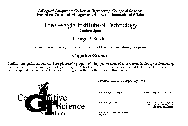 Students receive their MS or PhD degrees in a home discipline at Georgia Tech while participating in an interdisciplinary curriculum tailored to their specific interests in Cognitive Science. Students from any unit on campus may receive a Certificate in Cognitive Science upon completion of the certificate requirements and their degree. Students enter the certificate program after first being admitted to a disciplinary MS or PhD program at Georgia Tech.