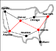 Consider the problem of finding the best route (here, fewest stops) between two cities on a map of airline routes. From the map we see that the best way to get from Los Angeles to New York is to stop in Denver and Atlanta.