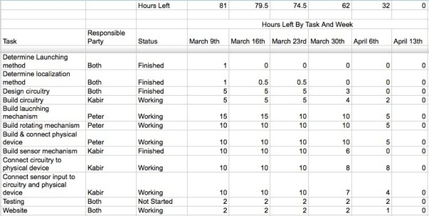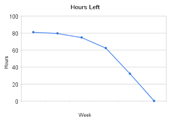 The images on this page show our groups progress on the project. Below is a SCRUMM chart showing our hours worked, including projected hours. The Graph to the right is a graphical representation of the hours left according the the chart below. As the graphs and charts show, we have completed our project.