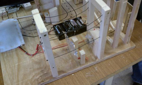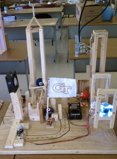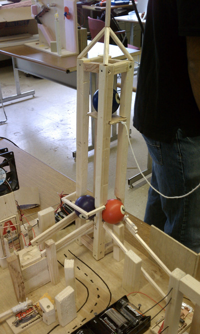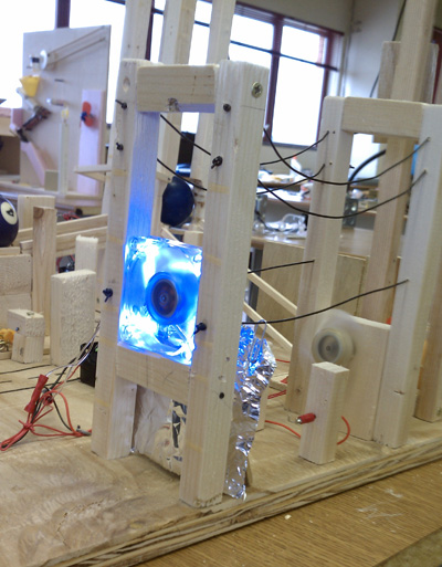 ›Step 8: The mouse trap hits ball 4 causing it to fall down, and at the same time completes a circuit that drives an PC power supply fan.