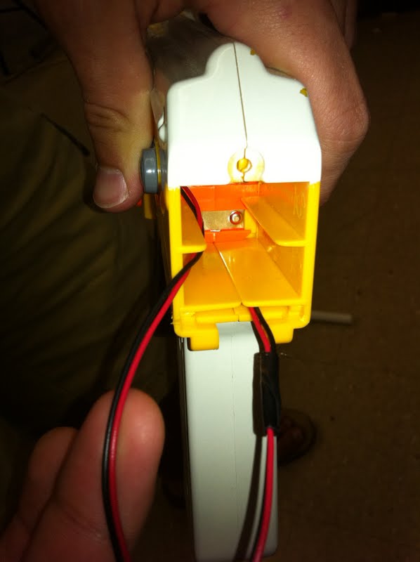 Prepare the waterguns for use in the device by soldering on wires that can activate the firing switch, and wires to replace the battery as a power source.