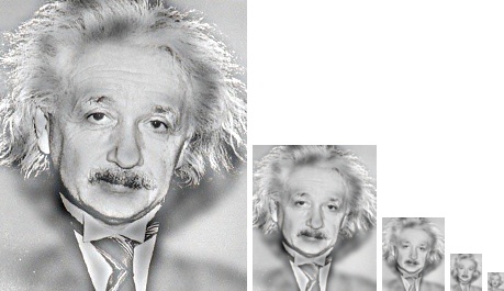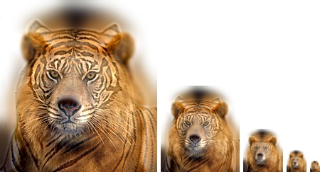 In the largest image, you can clearly see the high frequencies of the tiger. However, by around the third image, the mid frequencies of the bear are the most apparent. As the image continues to get smaller, the low frequencies of the lion predominate.