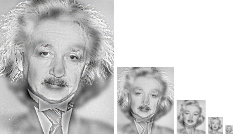 Illustration 7. Hybrid images of a low-frequencies Marilyn picture and a high-frequencies Einstein picture on the left, and viceversa on the right.