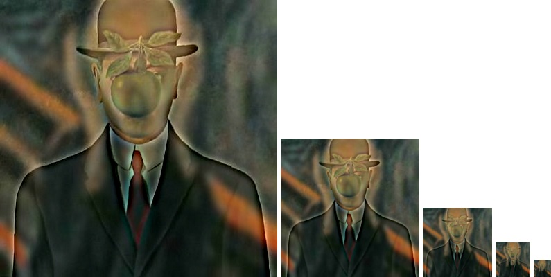 If you look at the above image from a close range, it looks like a cat. However, the further you move away, the further it resembles a dog. We can formalize this by shrinking the image to various lengths using downsampling as shown below.