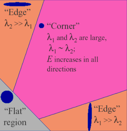 For this project, our keypoint detector of choice was the Harris Corner Detector (Harris & Stephens, 1988). A corner is defined as a small region in which a large change in intensity occurs in both the x and y directions. Both of these directions must experience a change, otherwise the region could be simply an edge or other low-detail point. The gradients for the input images are calculated using two Sobel filters, one oriented for the x gradient and the other for the y gradient. Next, these gradient images are smoothed using a Gaussian smoothing filter. Using these smoothed gradients, we can calculate the second moment matrix at each pixel in the image. A unique property of this matrix is that its eigenvalues describe the characteristics of the gradients at that point. When both eigenvalues are large in magnitude, and similar in magnitude, we have found a corner. The graphic on the left illustrates these characteristics.