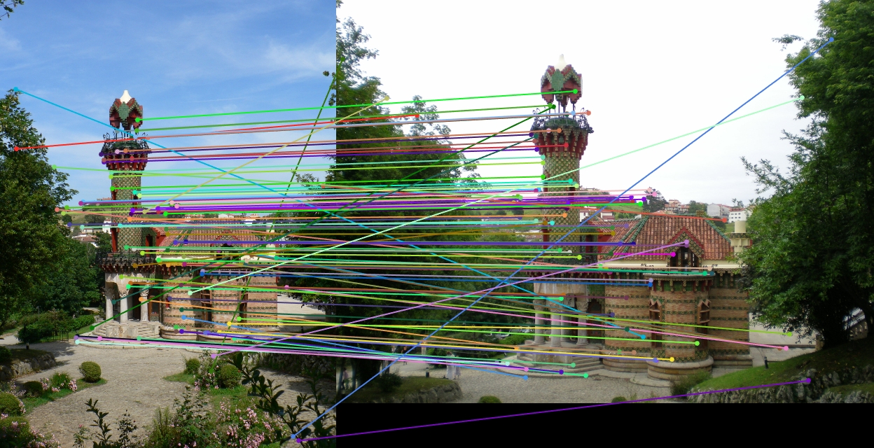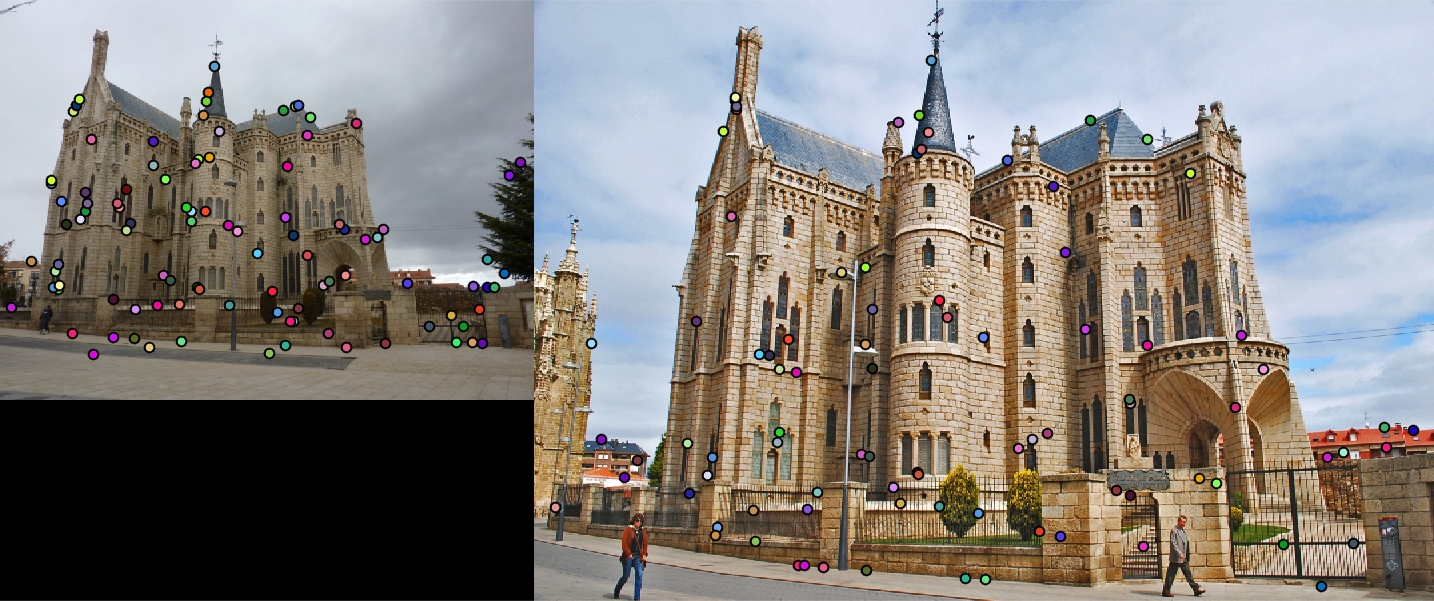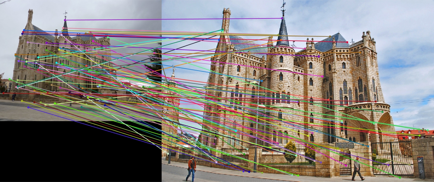 The limitations of this implementation quickly begin to show when more challenging examples are used. The provided Episcopal Palace image pair has a large degree of scale difference between the two images. I did not incorporate any SIFT octaves or keypoint scales in my implementation, so most of the keypoints detected did not correspond between the images. Additionally, there is a large amount of repetition in the details of the building, so matches between features were often incorrect. As a result of the lack of scale invariance, the accuracy for this image pair was extremely low, 8%.