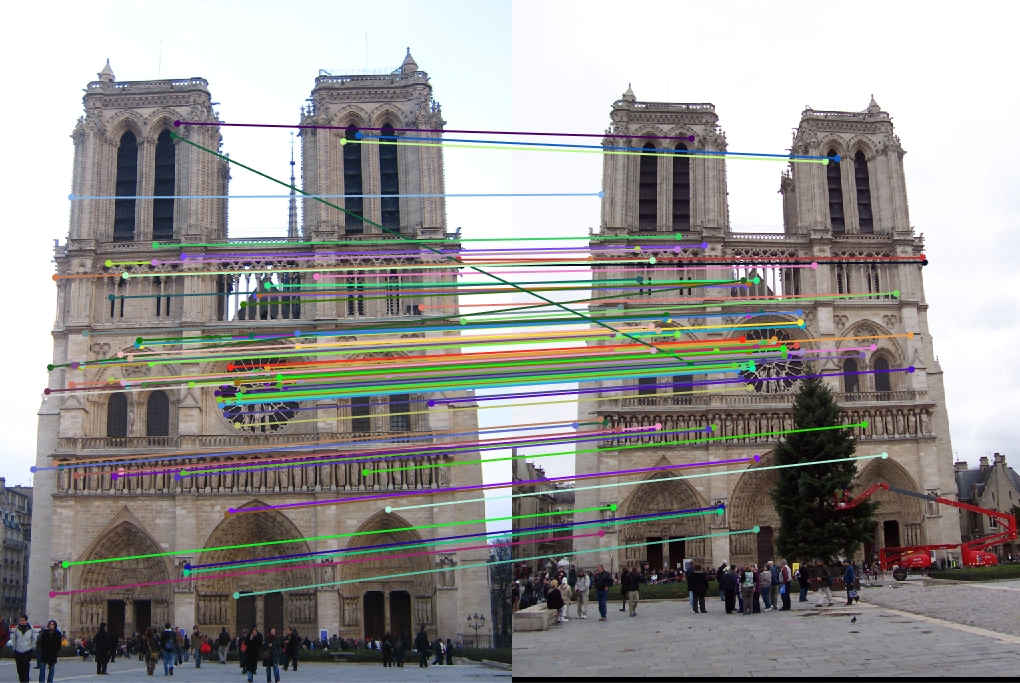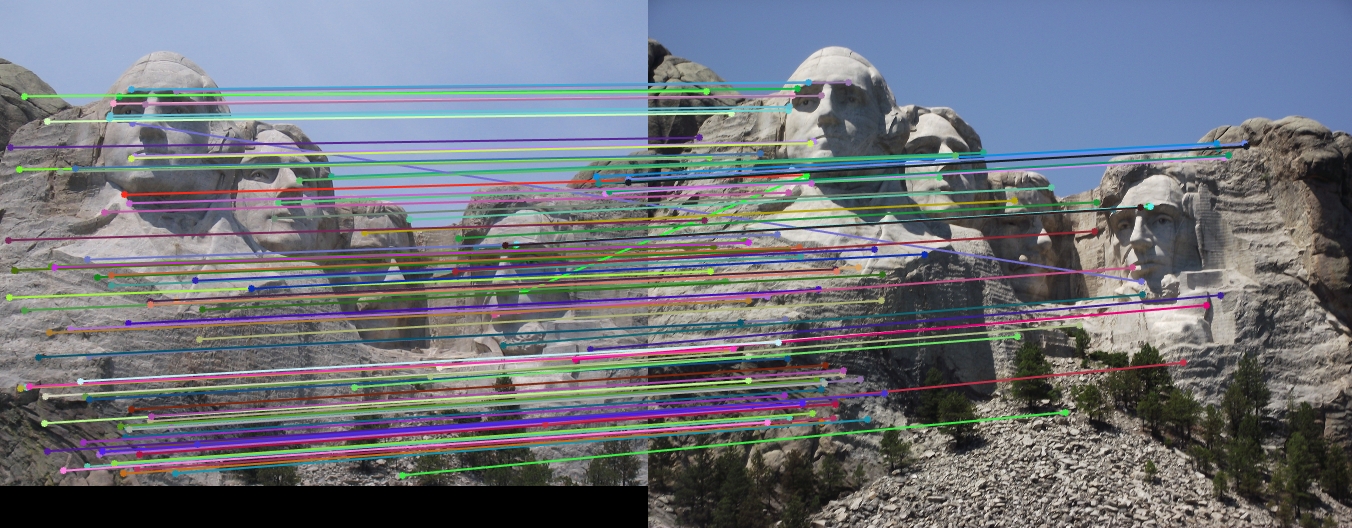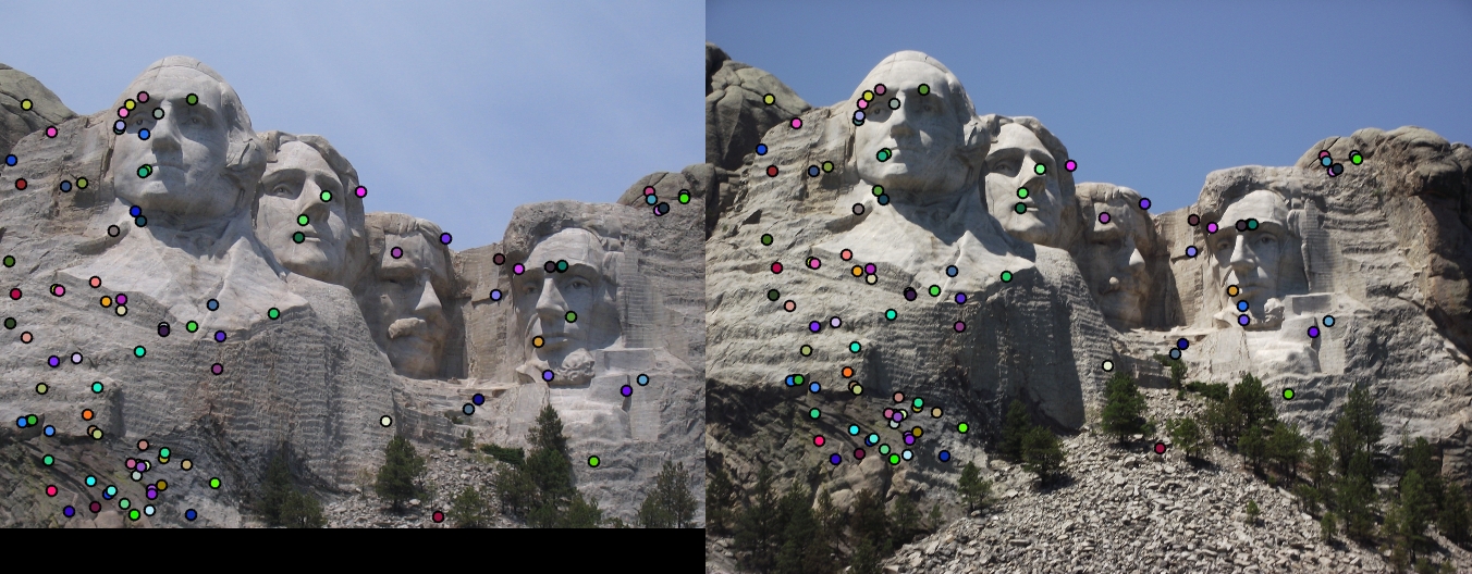 Using the given groundtruth points, I was able to achieve an accuracy of 93% on the Notre Dame image pair. I was able to obtain an even better 97% on the Mount Rushmore image pair.