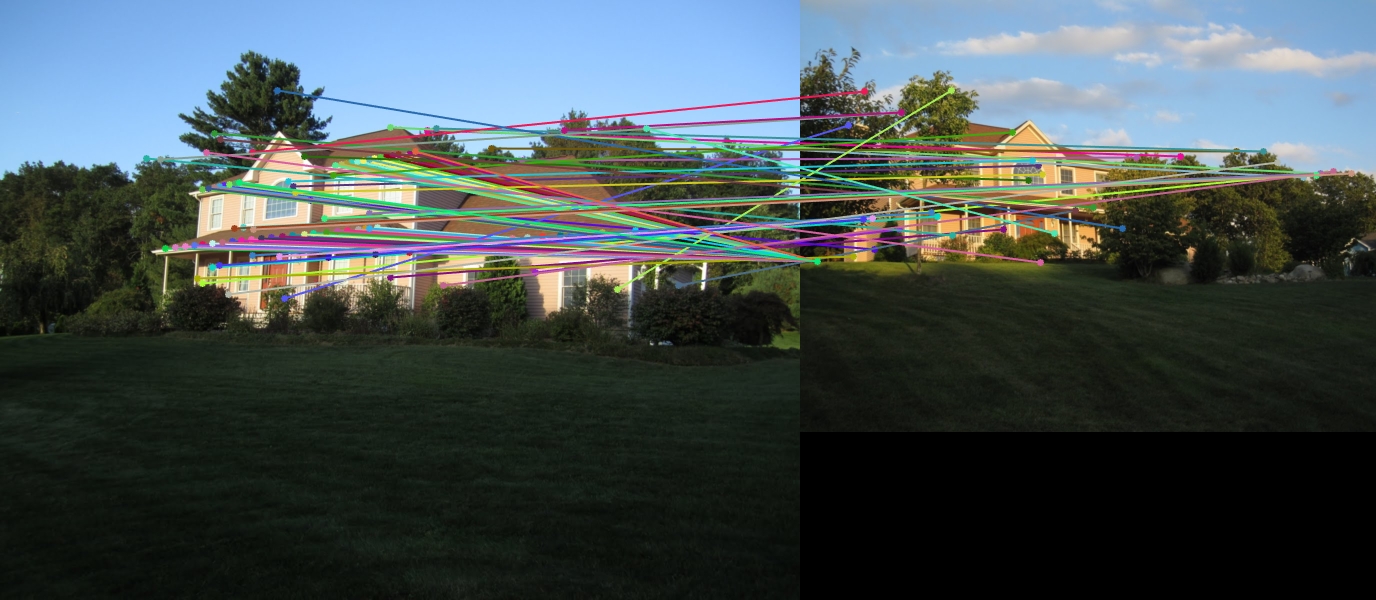 I tested my feature detector and descriptor on additional images provided in the supplemental materials. Although there are no ground truth points, it is still fairly easy to assess performance by observing the match lines between the two images. If the lines seem to follow a consistent pattern and do not cross often, we can conclude that the keypoint matching was relatively successful.