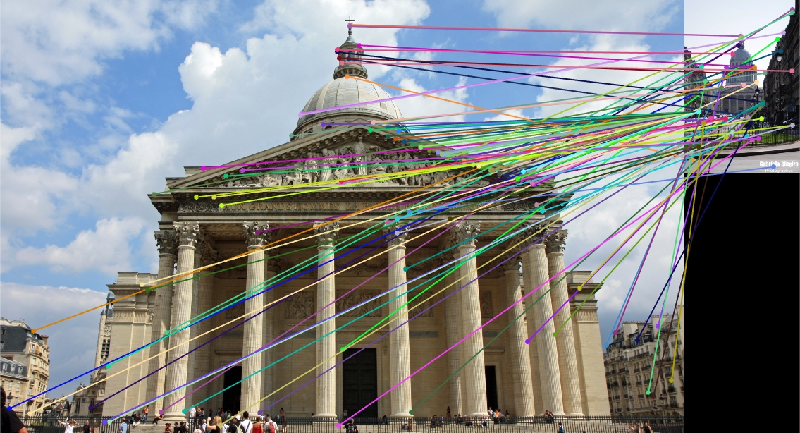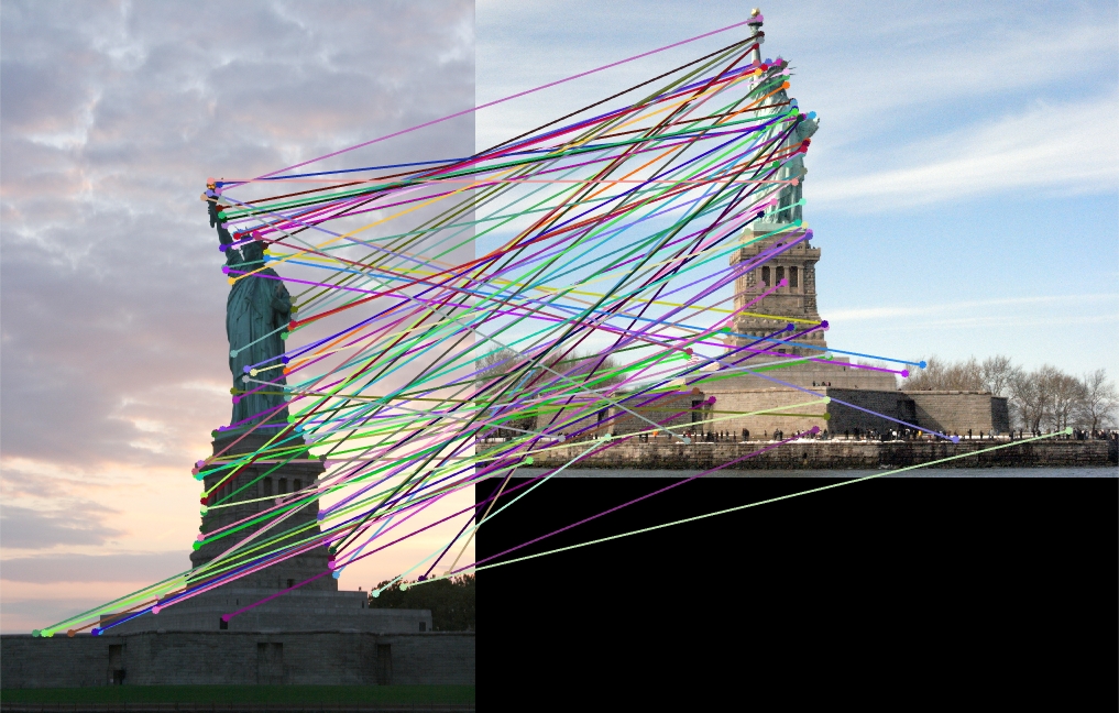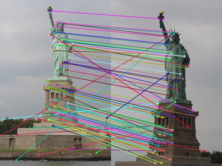 I challenged my implentation with a few other provided examples. The following images demonstrate a few more specific cases in which the pipeline failed substantially. In the first image, the two images are taken from entirely different perspectives, which introduces not only a fair amount of scale difference but also some keypoint rotation. In the second image pair of the Pantheon in Paris, it is difficult for even a human to immediately understand that the two images show the same building. The second image is taken from a significantly farther distance, meaning the amount of overlap between the images is reduced greatly. Finally, in the last image pair the two images of the Statue of Liberty are made different not only by a large perspective shift but also by significant lighting differences.