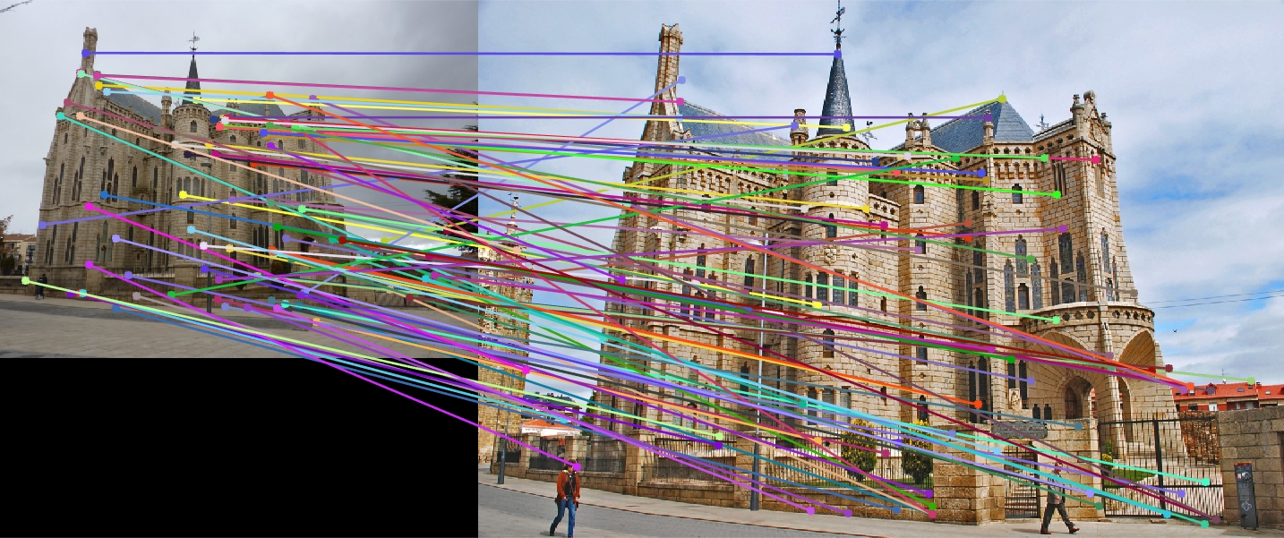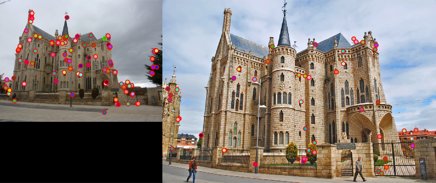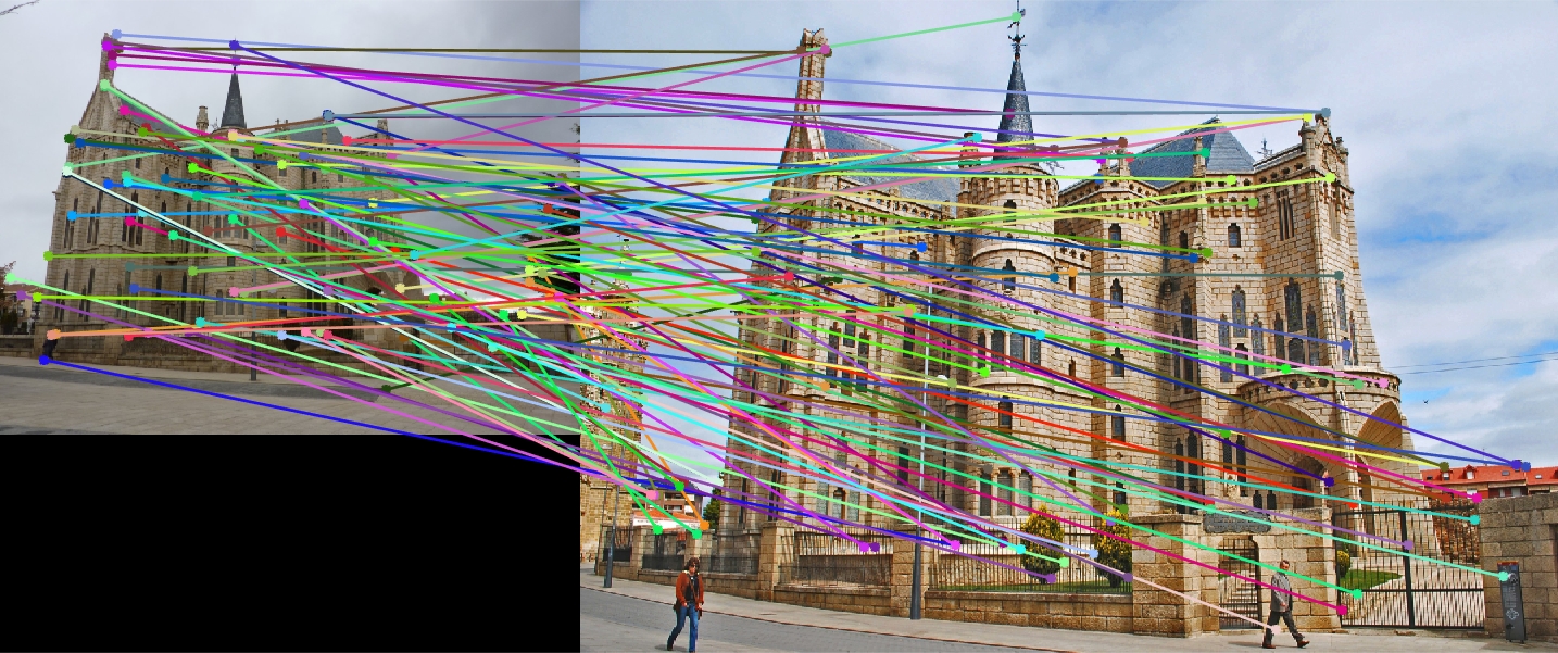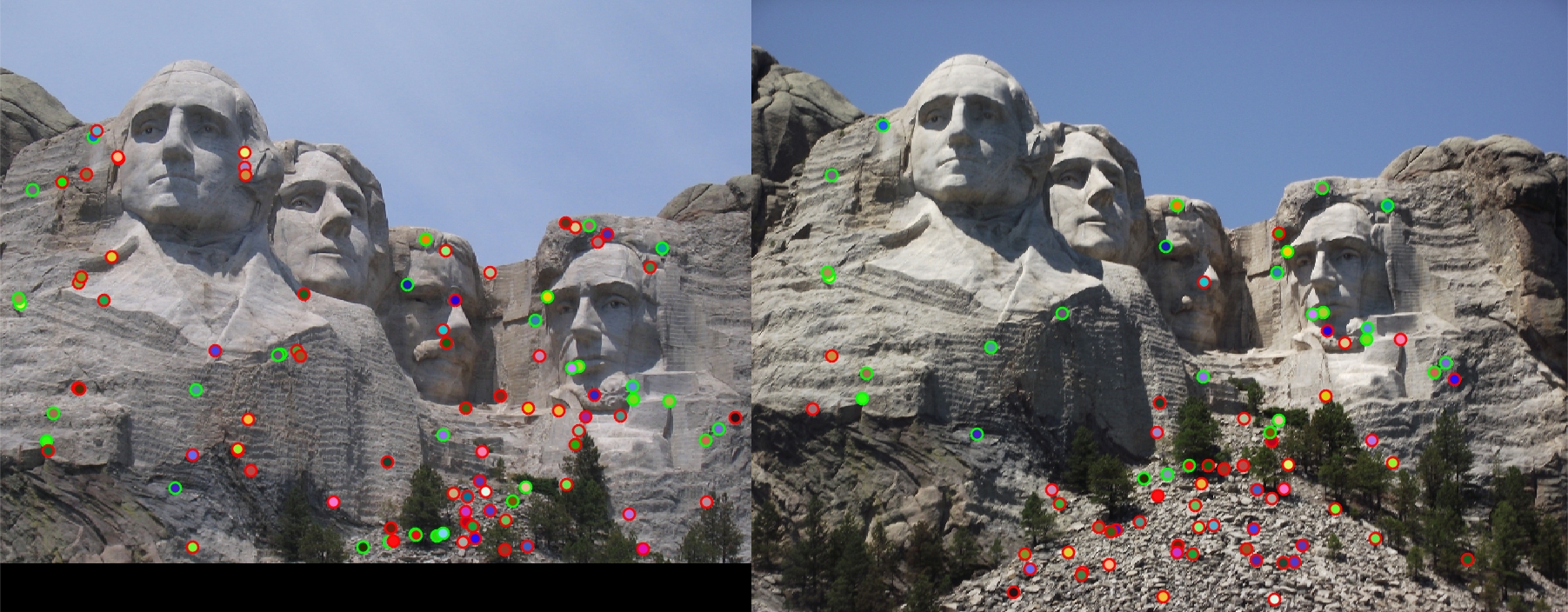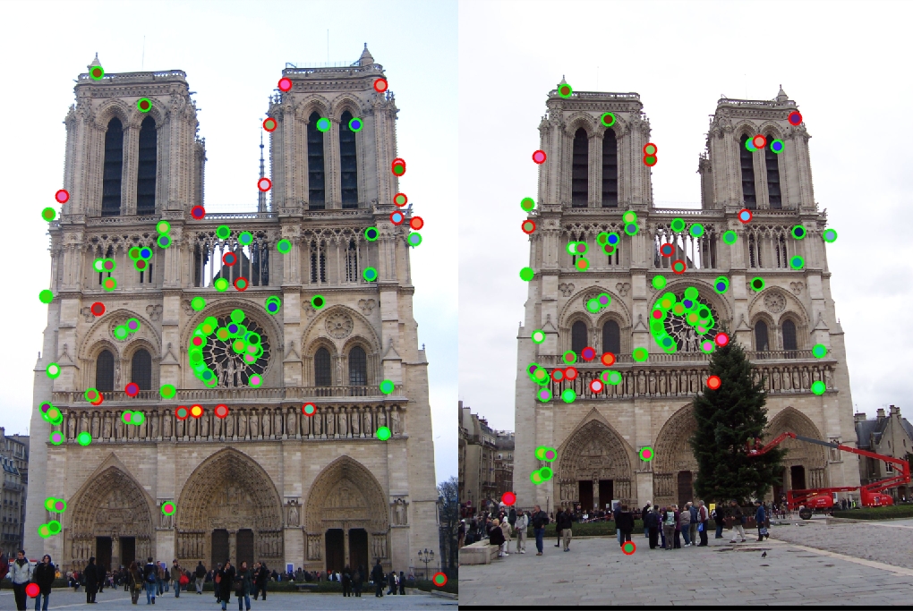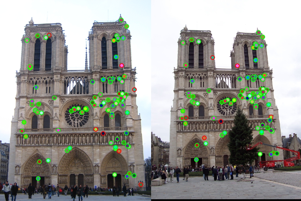 While the Notre Dame and Mount Rushmore pairs performed very well, the Gaudi test pair performed very poorly. However, with some parameter tuning (increasing the gaussian blur before finding interest points) I was able to increase the test accuracy to 8%.