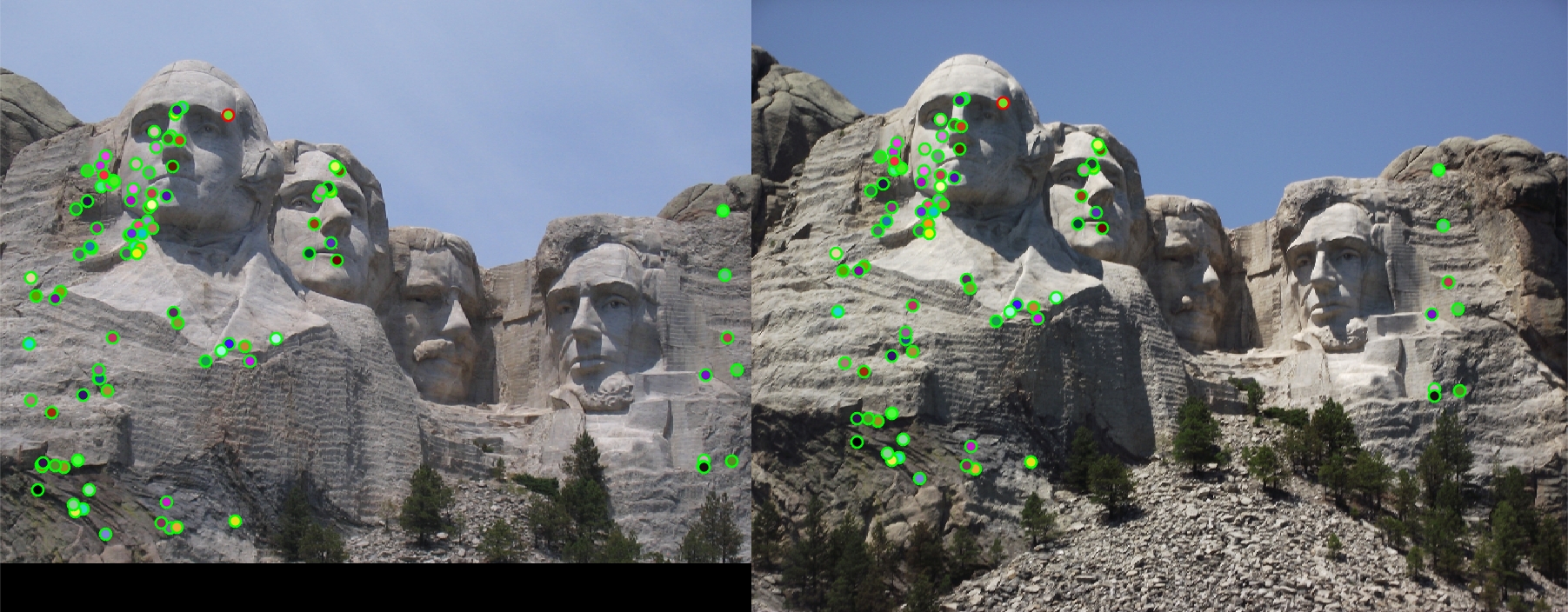 When using cheat_interest_points() instead of my own implementation, I got scores of 76%, 53%, and 14% on the Notre Dame, Mount Rushmore, and Gaudi test pairs, respectively. With the full basic pipeline including Harris corner interest point detection, SIFT-like feature description, and Nearest Neighbor Distance Ratio matching, I was able to achieve scores of 99%, 96%, and 4% accuracy on the three test pairs. Here are the results for those scores: