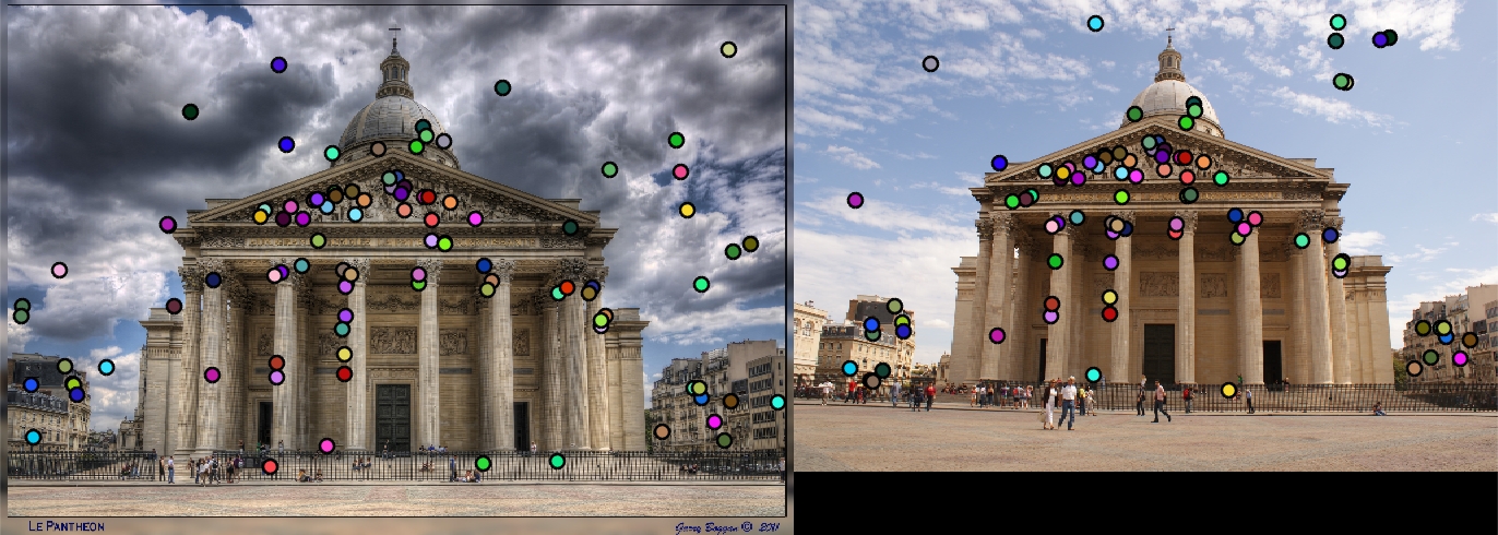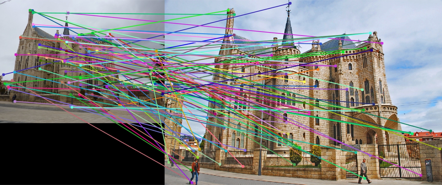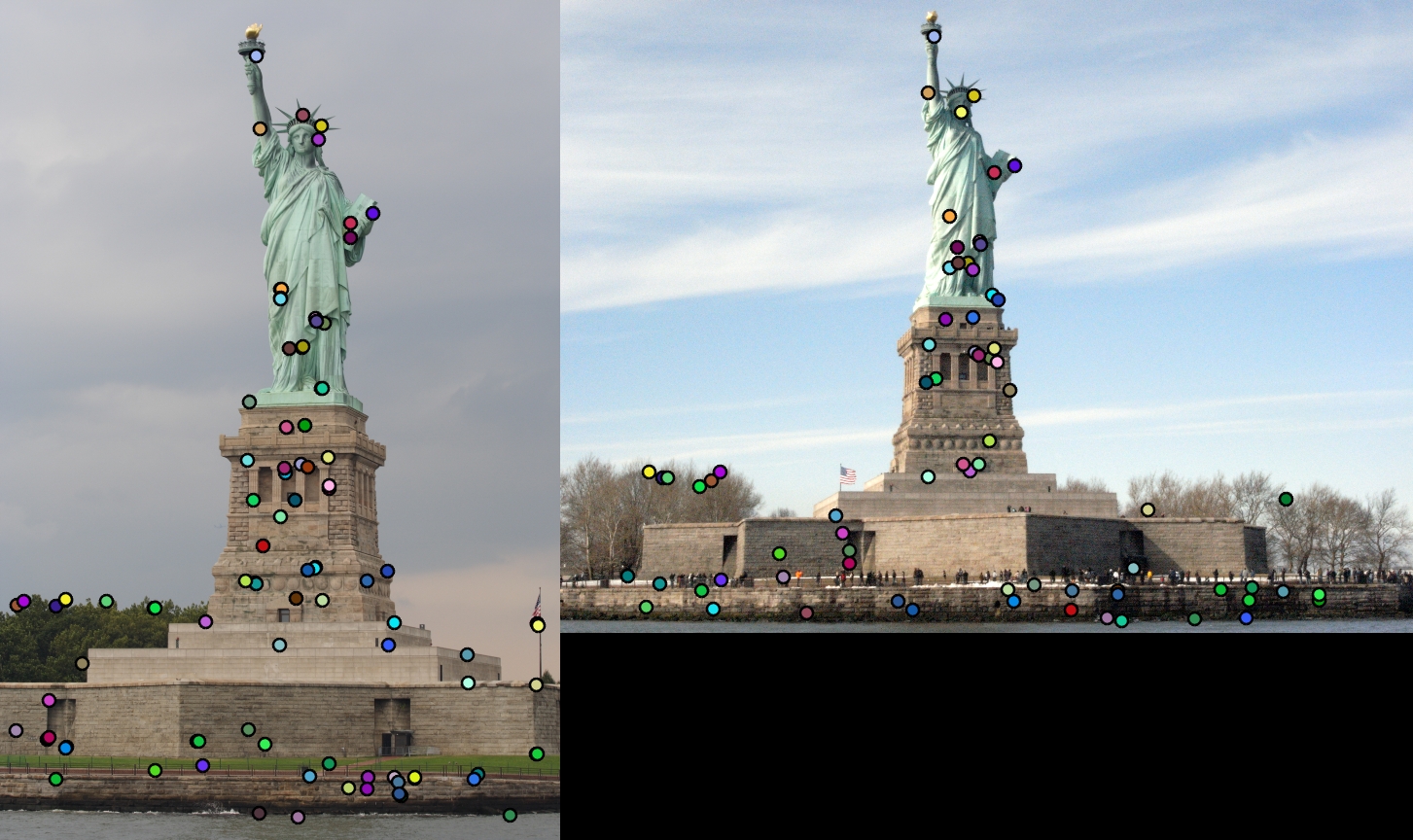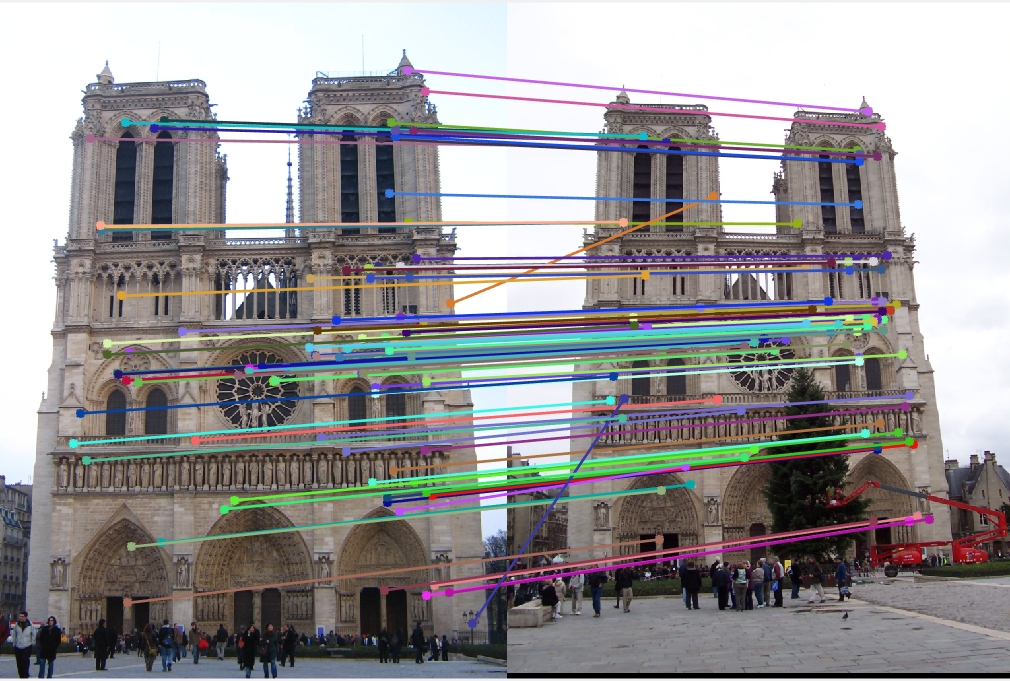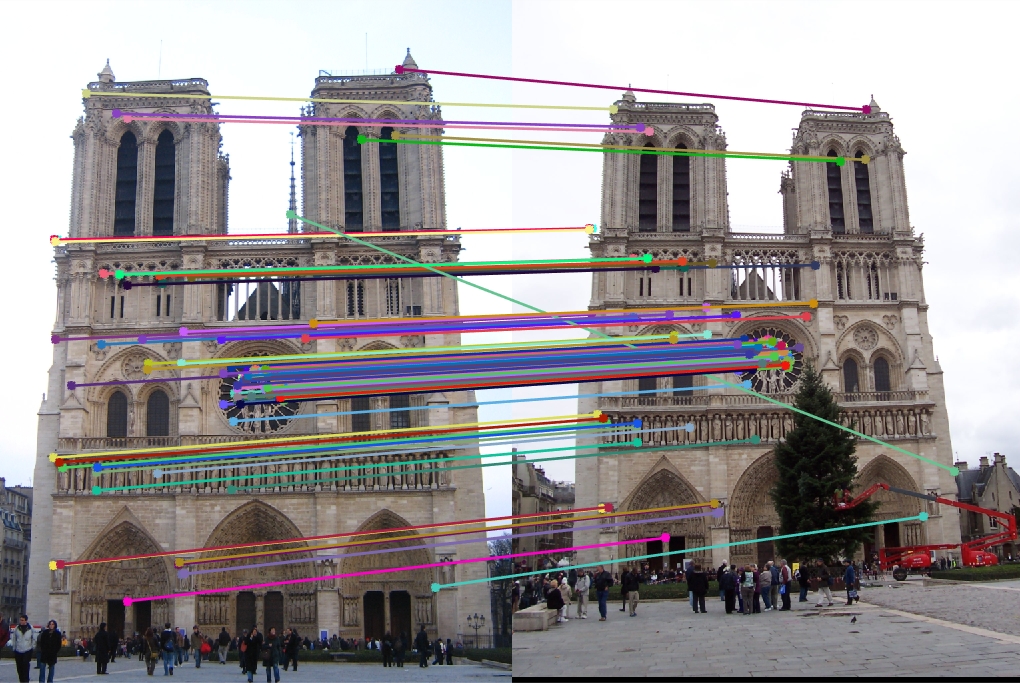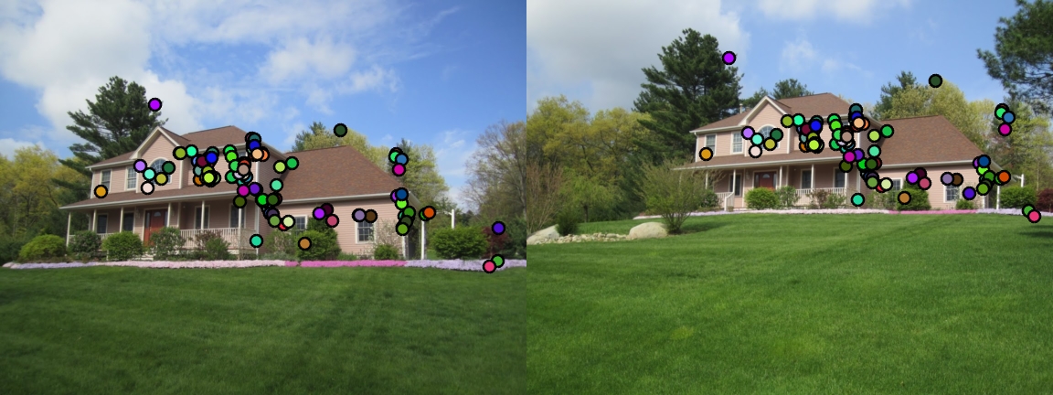 Finally, we show matches on extra image pairs. These results are obtained using Harris interest point detection with scaling, SIFT features with scaling, and NNDR matching.