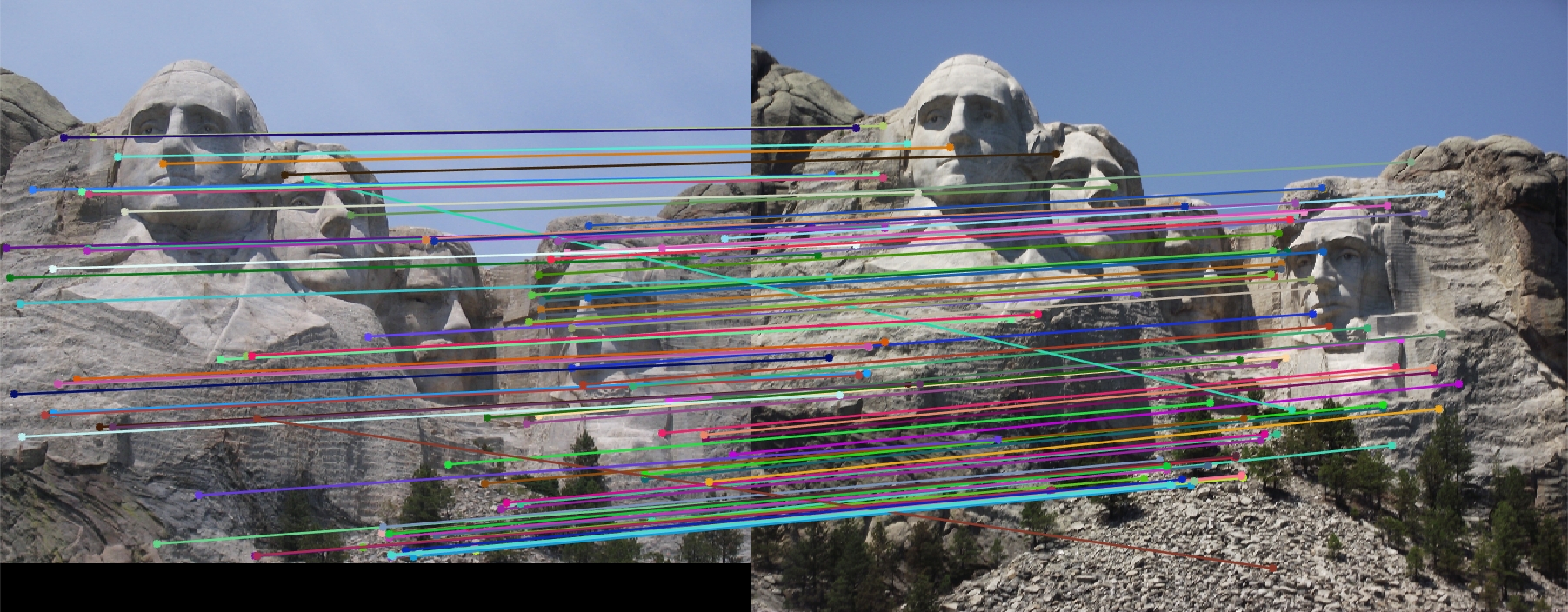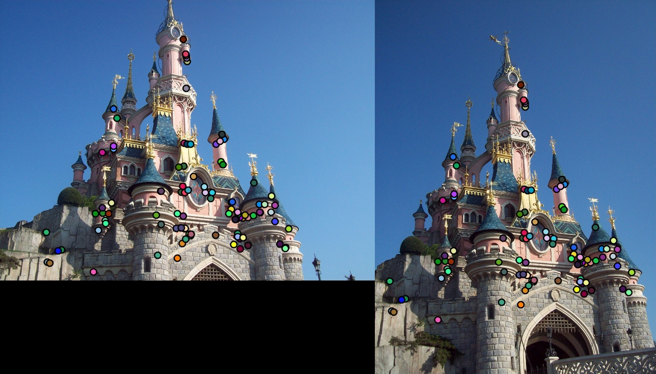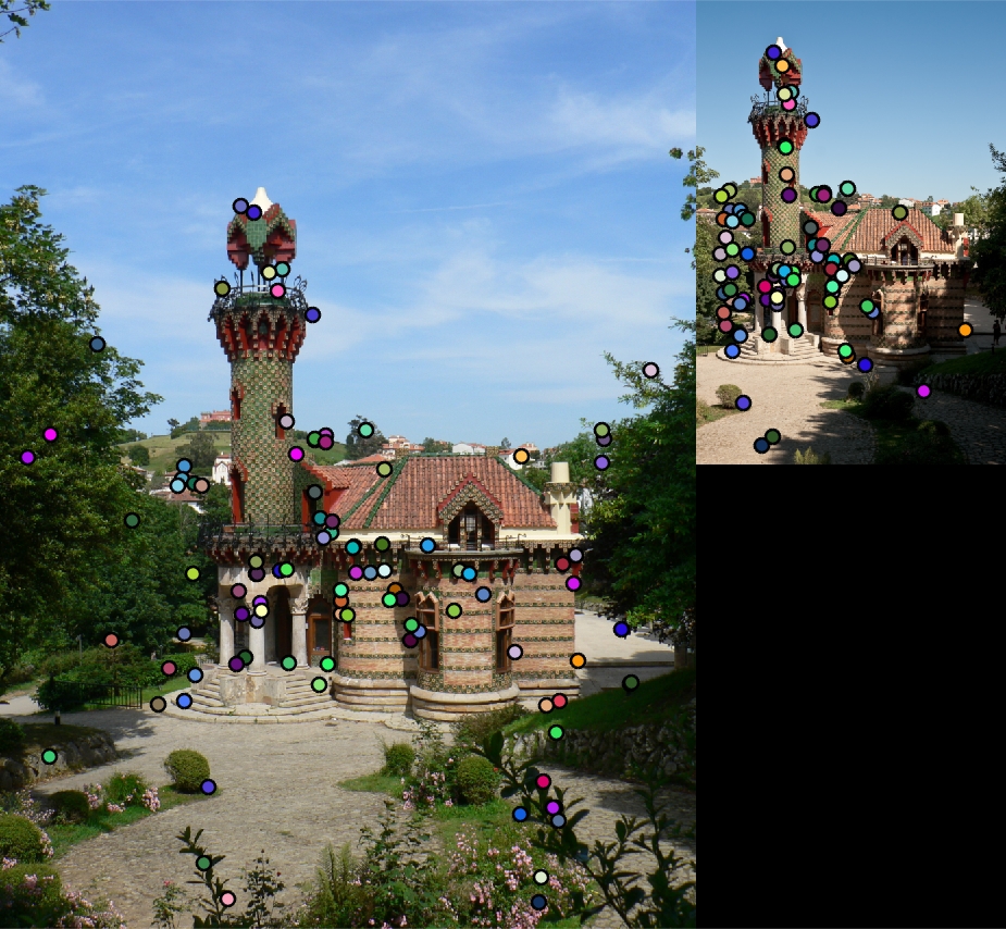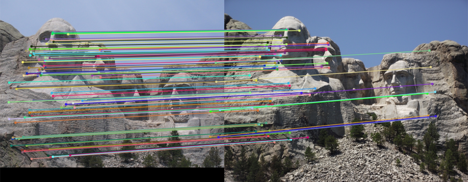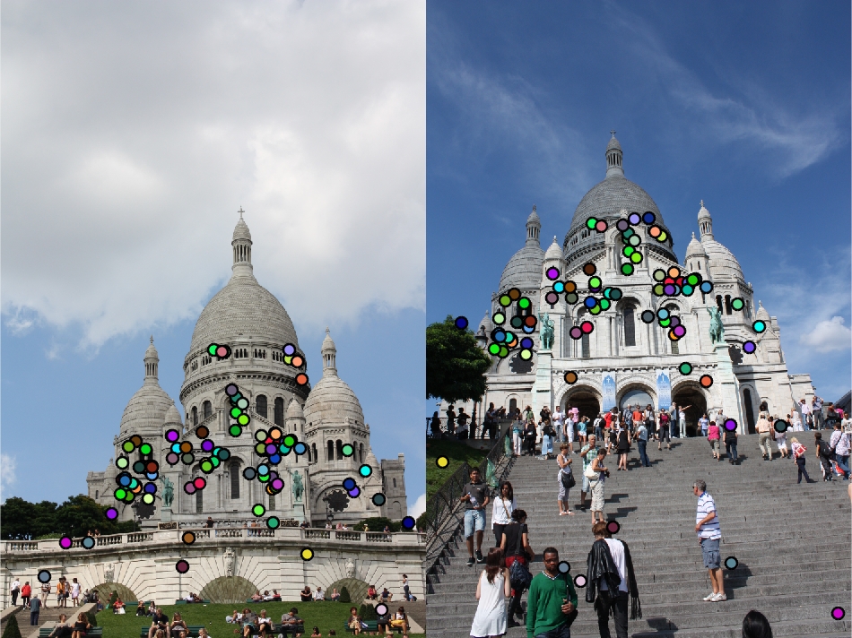 Finally, we show matches on extra image pairs. These results are obtained using Harris interest point detection with scaling, SIFT features with scaling, and NNDR matching.
