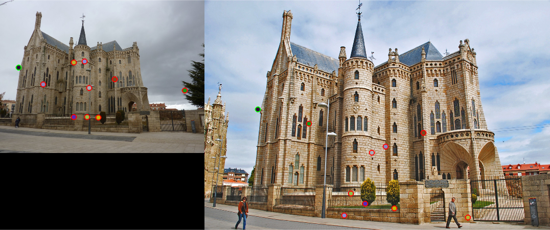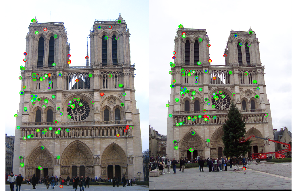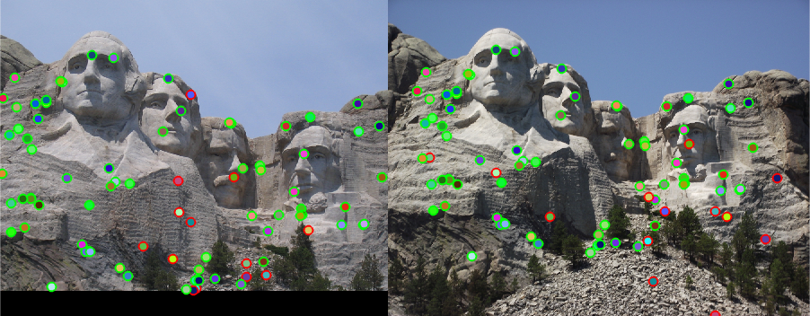 The matching accuracy is over 80% for both the Notre Dame and Mount Rushmore images. However, the Episcopal Gaudi images only have an accuracy of 10%. This is likely due to differences in scale, lighting conditions, and orientation between the two images. The matching accuracy is also affected by the number of matches used because selecting only the most confident matches generally yields better results. For the Notre Dame images, taking the top 100 matches produces an accuracy of 83%, while taking the top 50 matches increases the accuracy to 88%. Similarly, the Mount Rushmore set has an accuracy of 85% on 84 matches and 94% on 50 matches. On the other hand, images such as Episcopal Gaudi do not produce many matches at all because most points fail the ratio test. In this case, even the most confident matches are not very accurate.