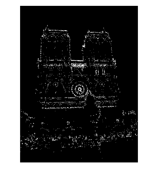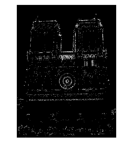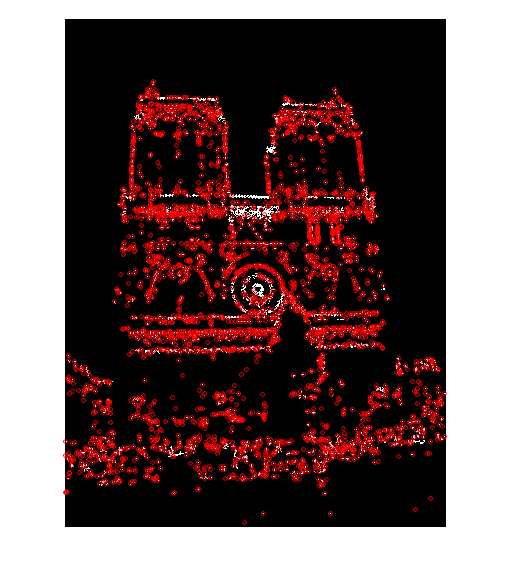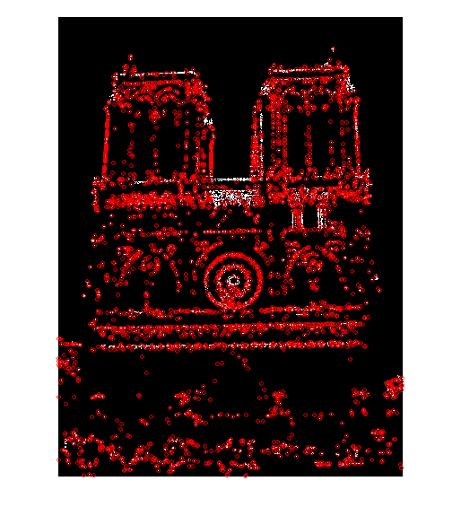 The non-maximum suppression code uses Matlab's bwconncomp() function to identify each connected component in a thresholded version of the cornerness matrix. For each of the resultant components, the pixel with the maximum cornerness is selected as an interest point and its coordinates are added to the output x and y vectors. The figures below show the interest points chosen by the Harris detector for two images of Notre Dame: