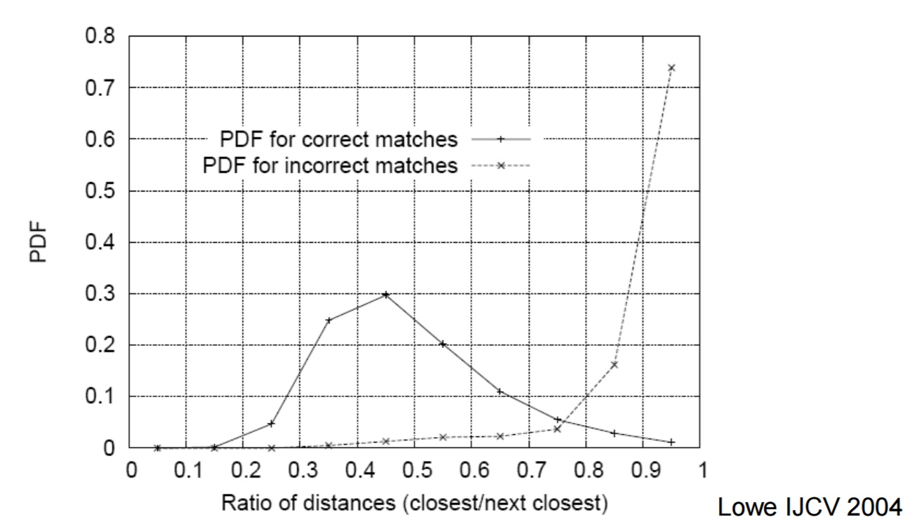 In my implementation I used pdist2 pre-calculate the distance between all the features at once in a matrix. Due to everything being in a matrix, all I had to do to find the nearest neighbor to each feature was to sort each column and get the first index. I then calculated the Nearest Neighbor Distance Ratio to get the confidence for that matching. I also included some filtering to remove NNDRs that we less than .75. I chose this as the limit because in the graph of the PDFs for correct matches the professor showed in class (displayed to the right) the likely hood of a match being incorrect greatly increased after that number. The entirety of my matching code is shown below.