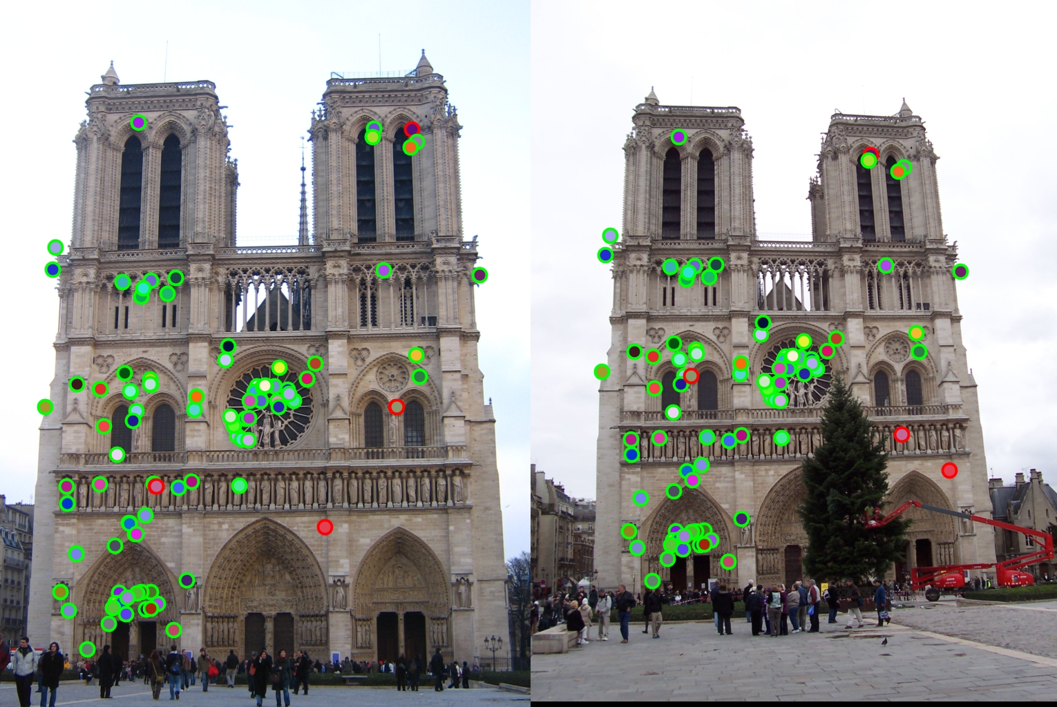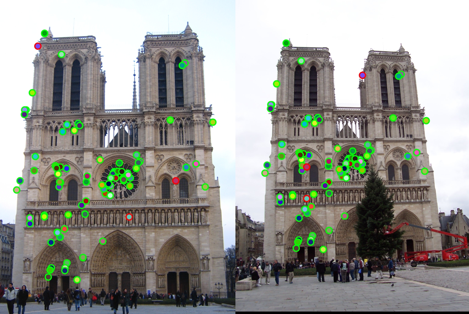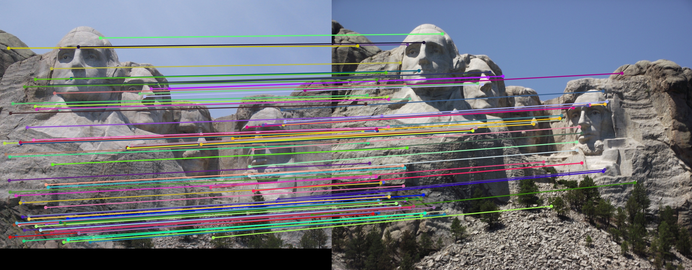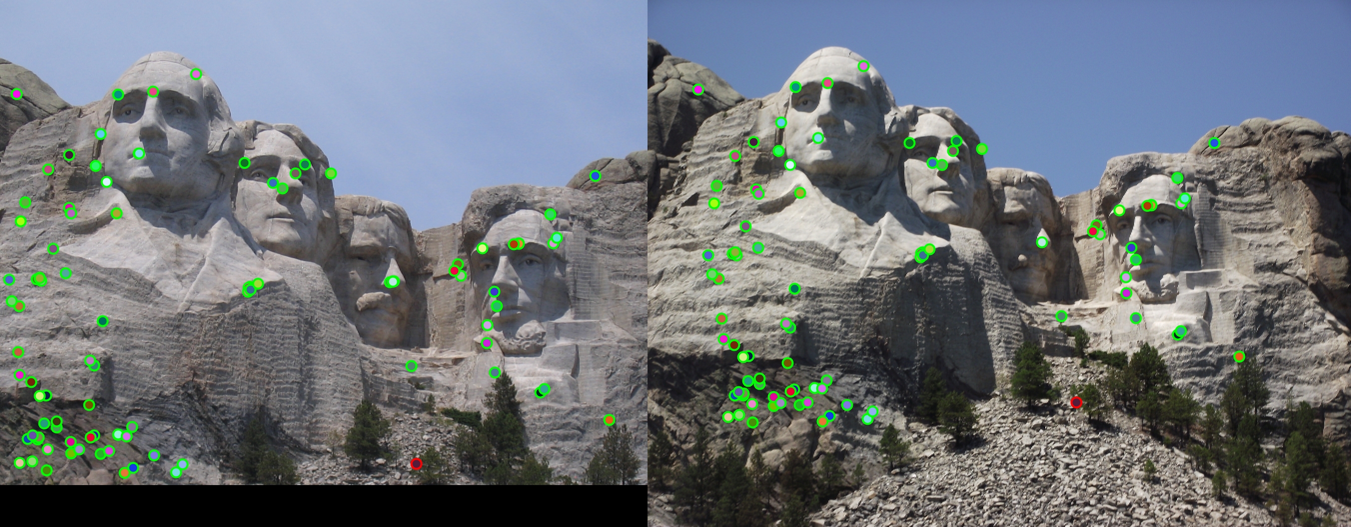 For all image pairs I only took the top 100 matches and had 97% accuracy for Notre Dame and 99% accuracy for Mount Rushmore. However I was only able to make 5 bad matches with the Episcopal Gaudi pair.