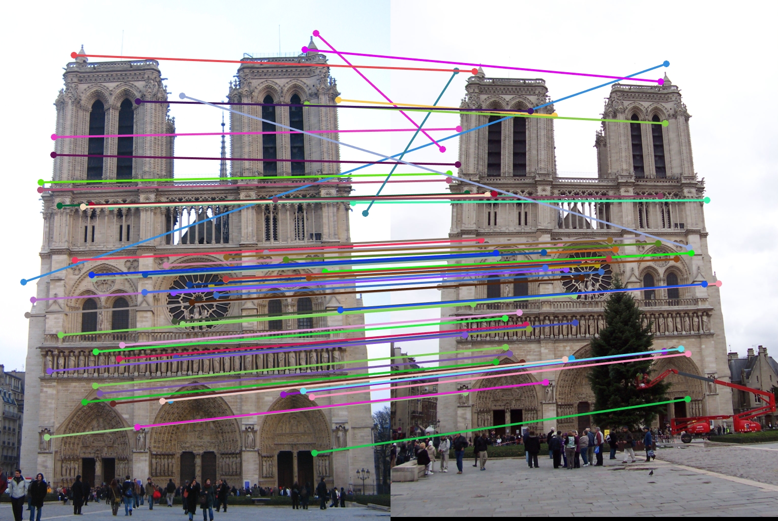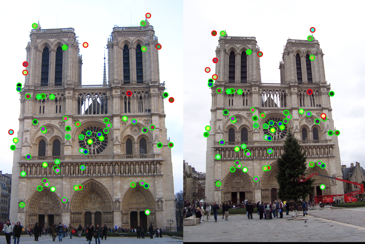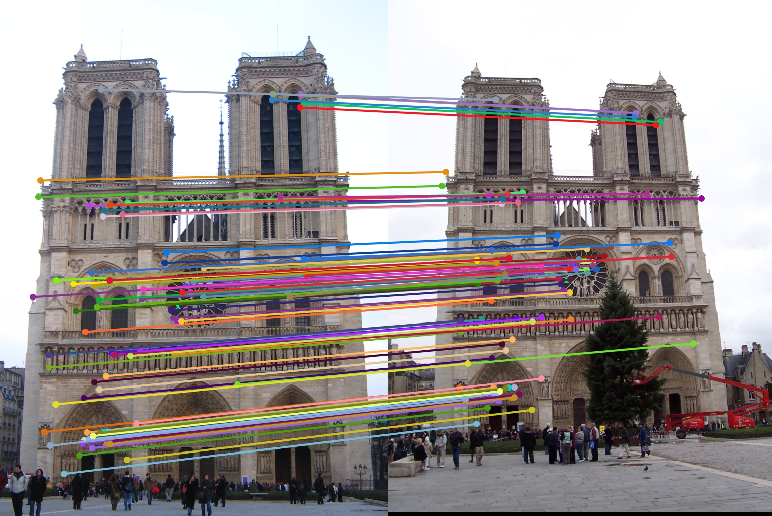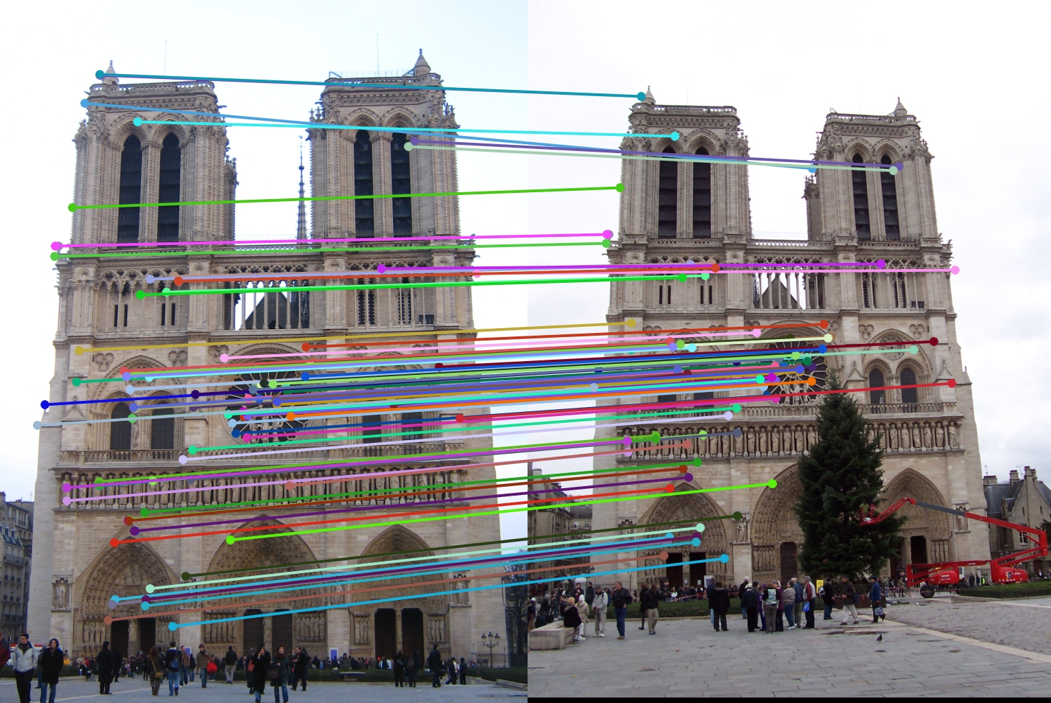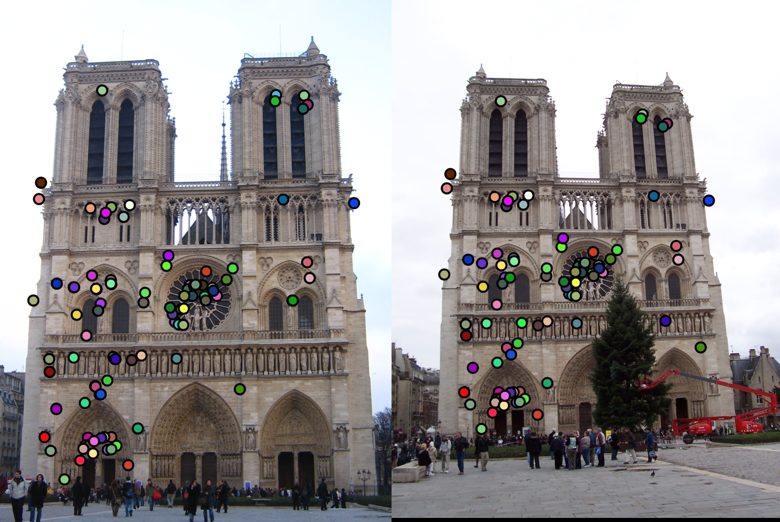 For all image pairs I only took the top 100 matches and had 97% accuracy for Notre Dame and 99% accuracy for Mount Rushmore. However I was only able to make 5 bad matches with the Episcopal Gaudi pair.