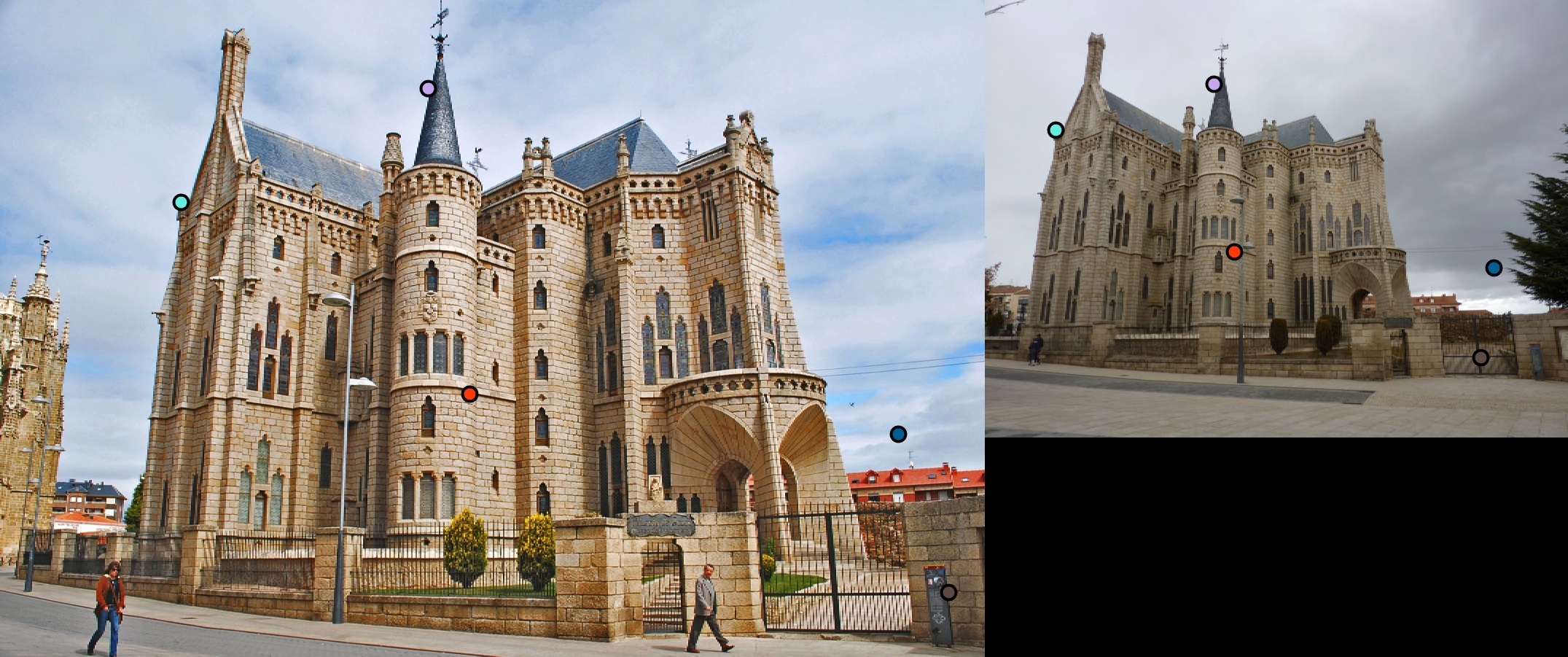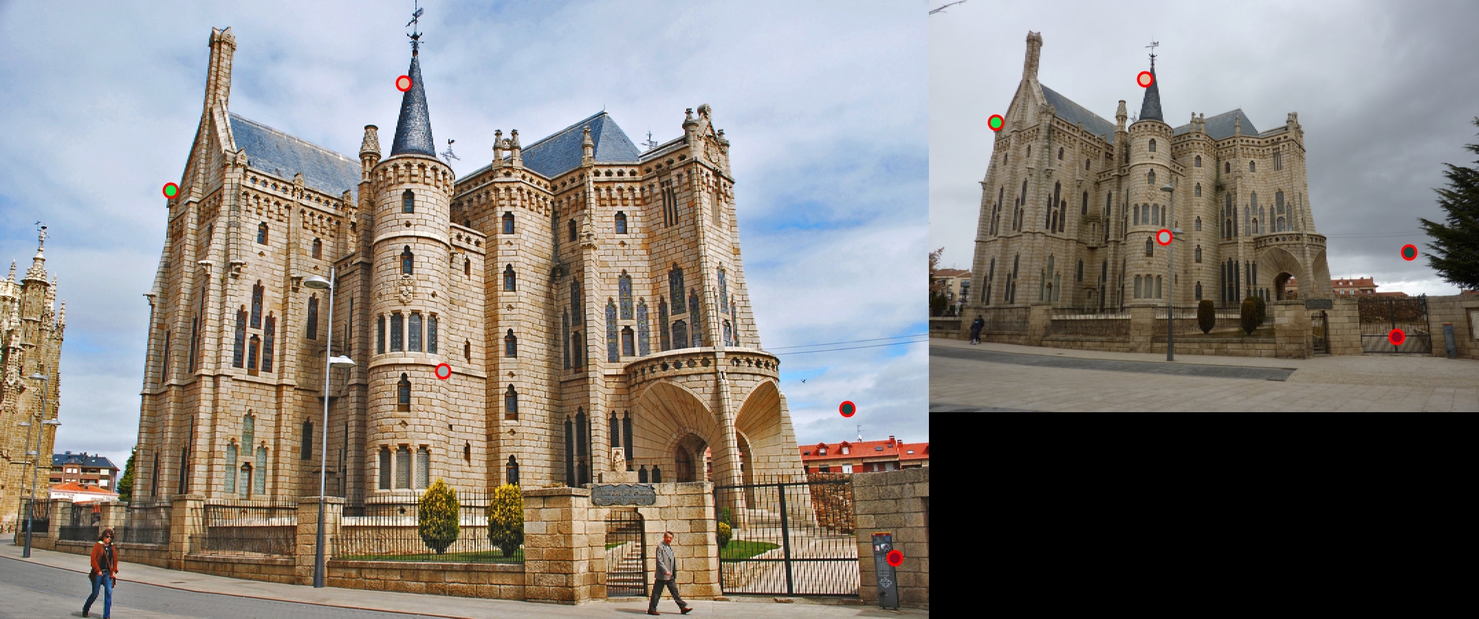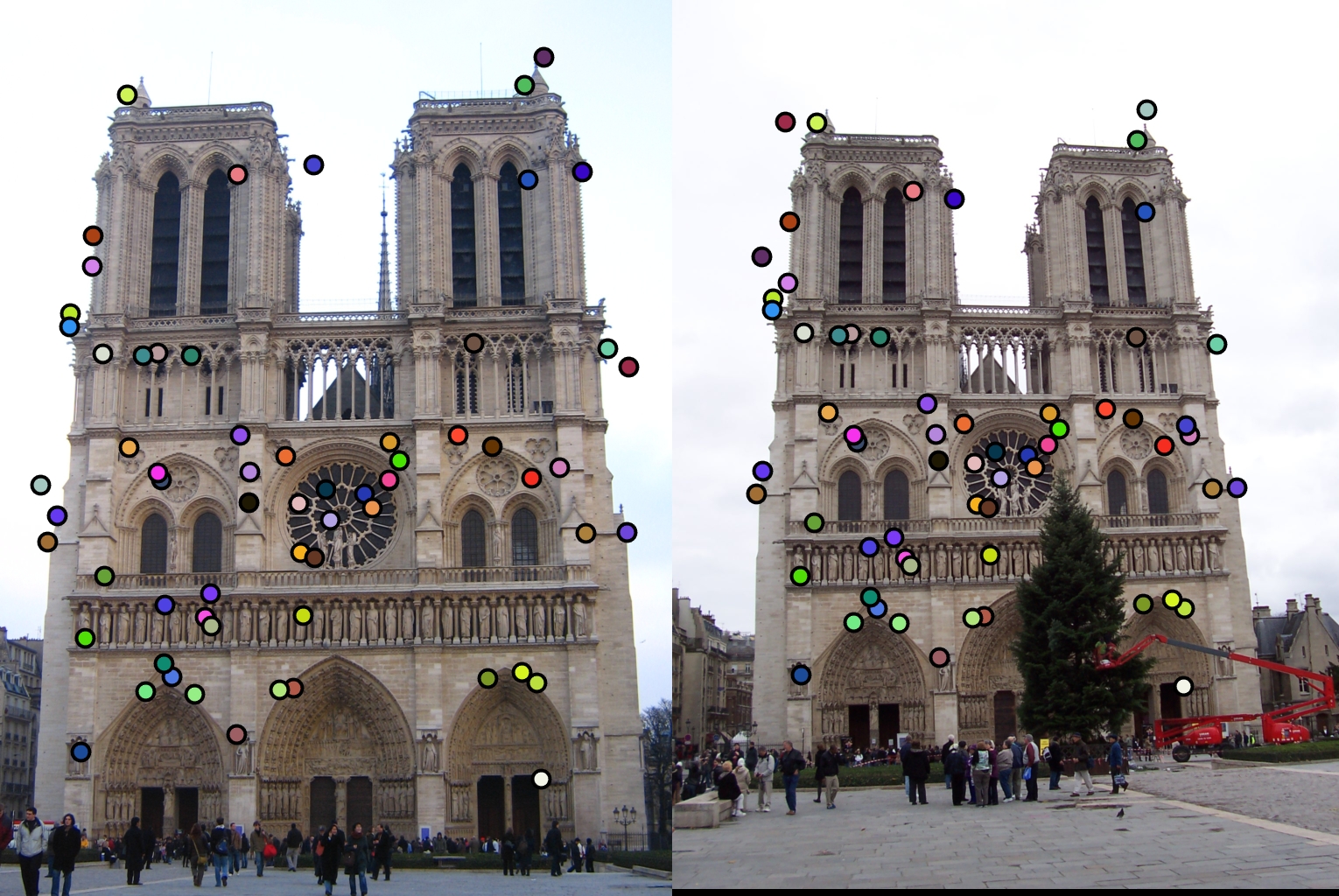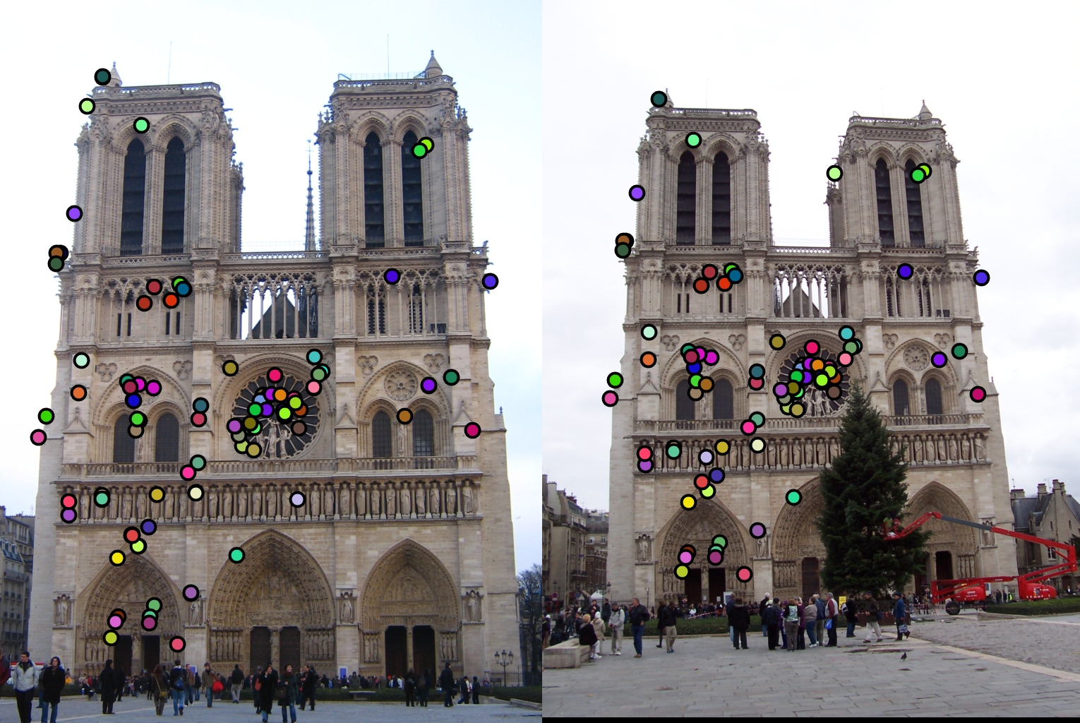 For all image pairs I only took the top 100 matches and had 97% accuracy for Notre Dame and 99% accuracy for Mount Rushmore. However I was only able to make 5 bad matches with the Episcopal Gaudi pair.
