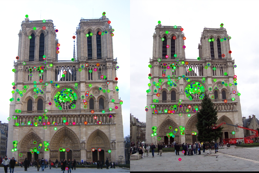 The Notredame results came out to be a horrendous 0%. The images were drastically harder to match than the previous two because of the high color, scale, and orientation variance. To improve the current code so that it could better match the Notredame image, I would need to implement scale selection or keypoint orientation into the interest point detection process.