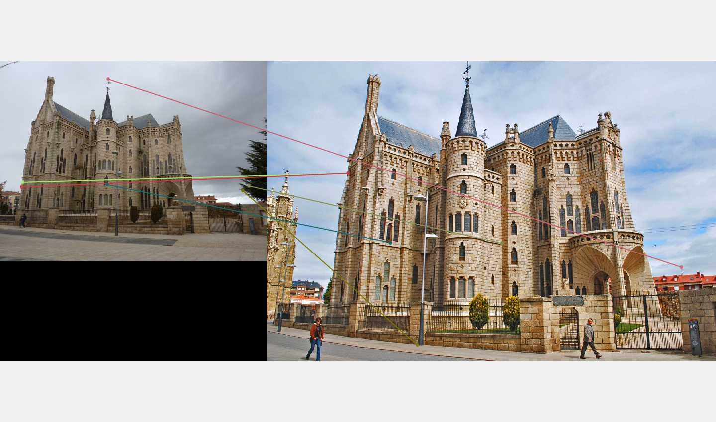 The Gaudi results gave about an 81% accuracy with the final code. Without the SIFT descriptors, and using the feature window as the descriptor gave about 82% accuracy with a 70% feature matching confidence threshold. The reason the feature window was acceptable for the Gaudi images was that there were very low scale or color variance across the images. Also, applying a weighted Gaussian across the cells for the SIFT descriptors gave a lower accuracy than without. Having a smaller standard deviation value for the weighted Gaussian lowered accuracy even more. This is likely because the Gaudi images have feature points that depend more on relative positioning, in which case scaling the feature or descriptor down to the center of the interest point would lower the accuracy of the match.