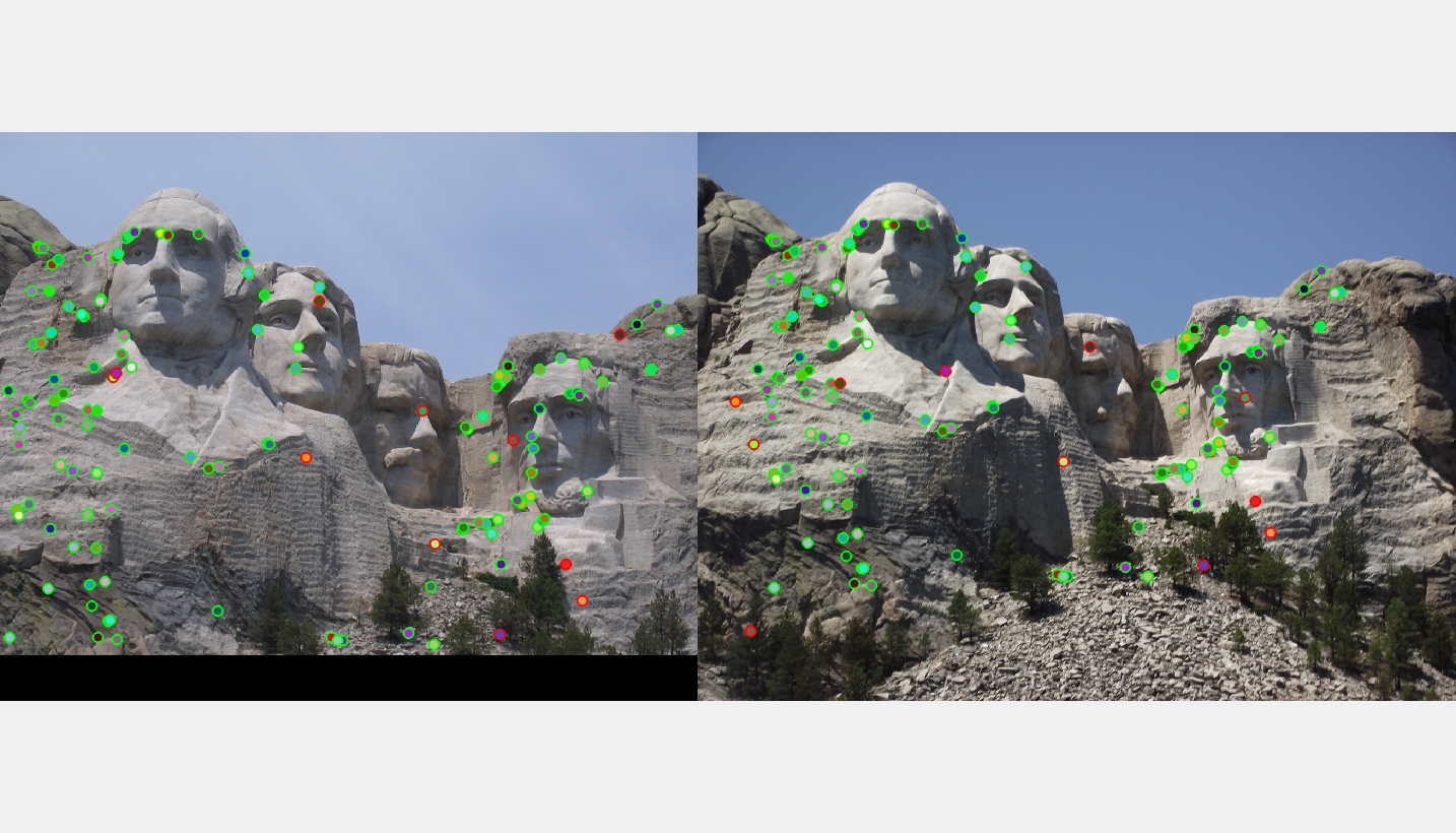 The Rushmore results were more promising than the Gaudi results with a satisfying 96% accuracy. Athough the color variance was a bit more significant across the Rushmore images than the Gaudi images, the feature matching still did well, mostly thanks to the SIFT descriptors. Although the mountain texture seemed repetative, it turned out that the Rushmore features were at least more distinct than the Gaudi structures.