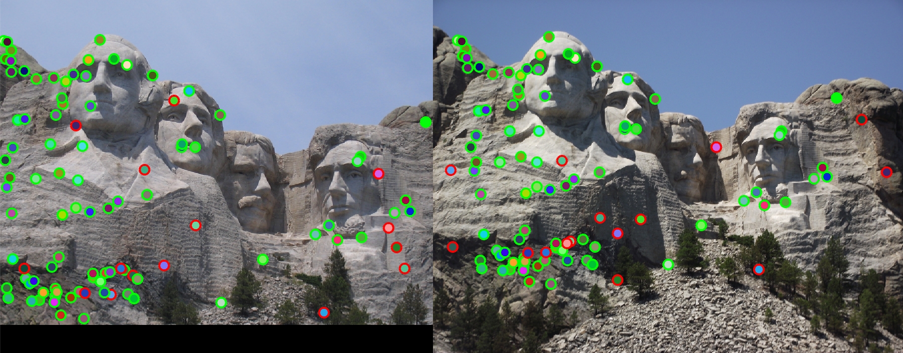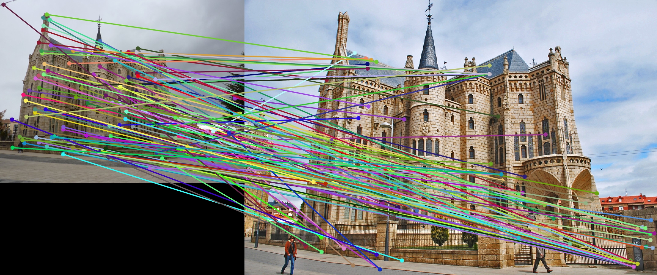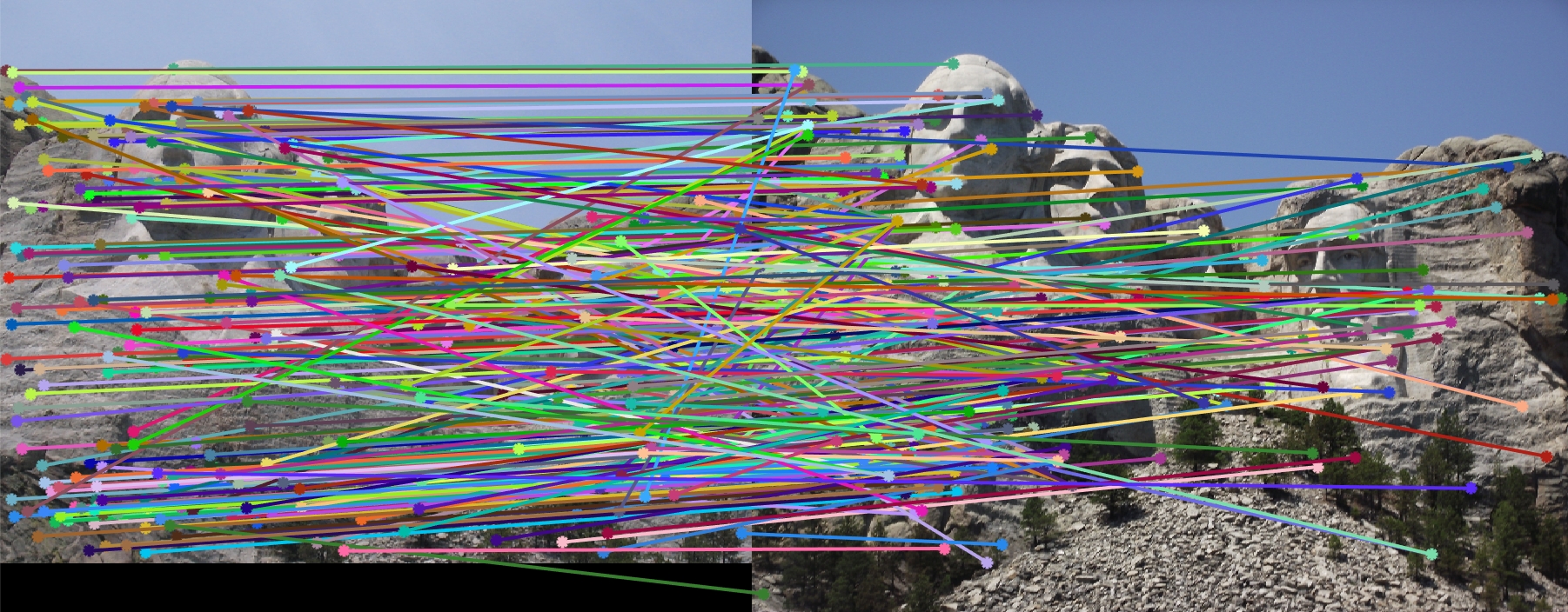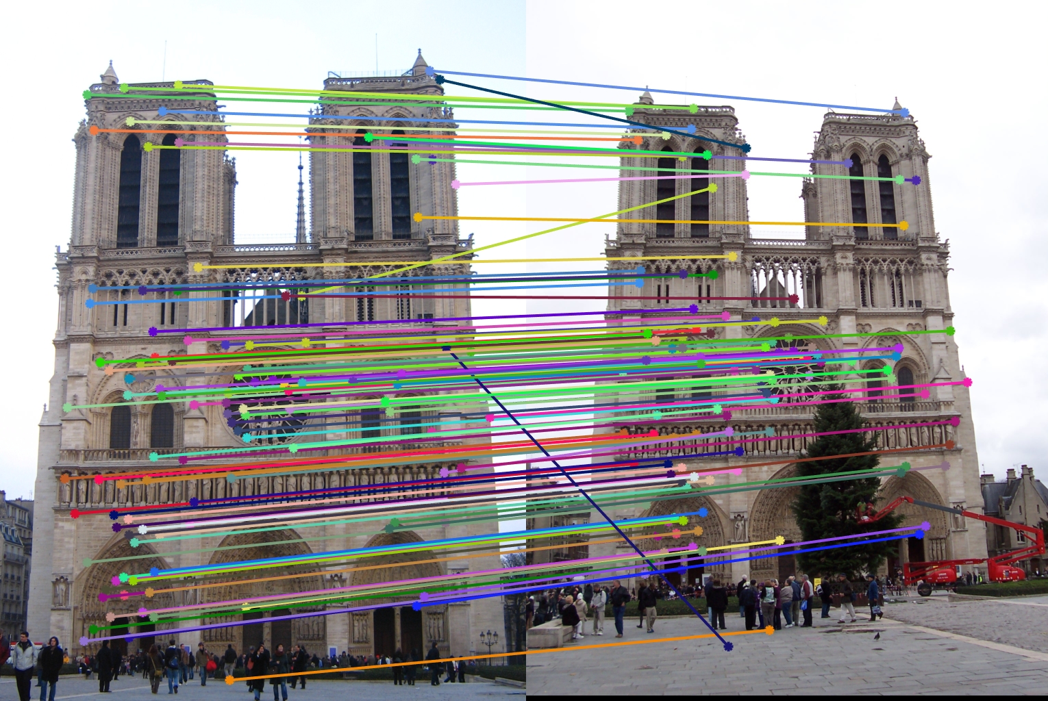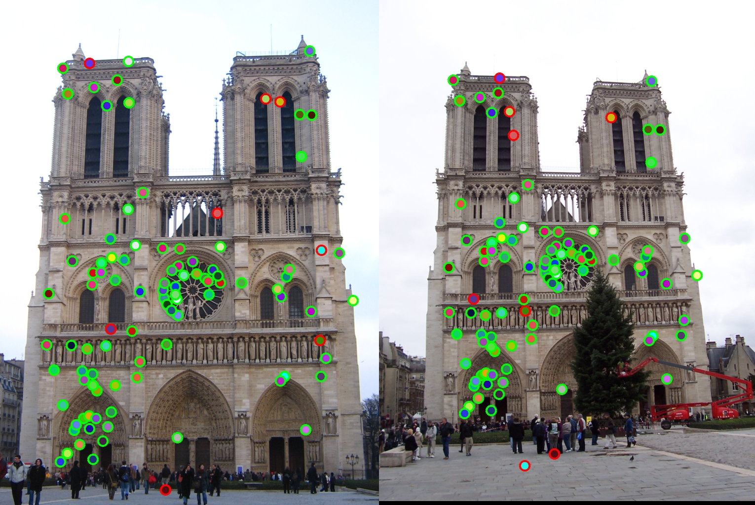 Below are the result of matching between 1) Notre Dame image pair; 2) Mount Rushmore image pair; and 3) Episcopal Gaudi image pair.
