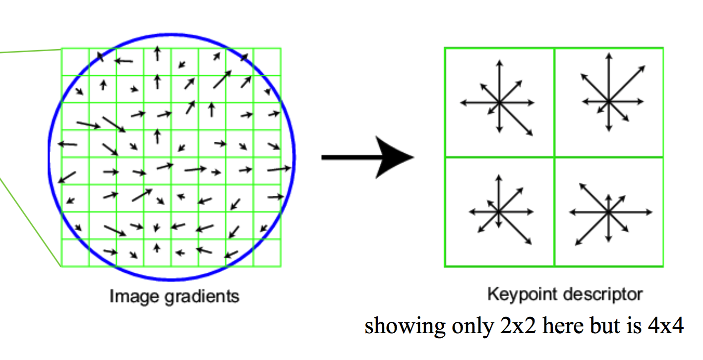For each of the intereset point, we apply the SIFT vector formation which consists of 8 orientations and 4*4 array of gradient orientation histogram weighted by magnitude. So in total, the descriptor is of 128 dimension.