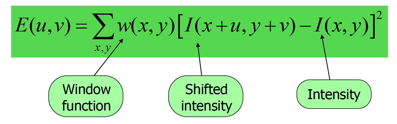 To identify corners, we apply a small window which shifts to all direction and check if there's a large change in intensity. To do so, we need to compute the change using Harris corner detector: