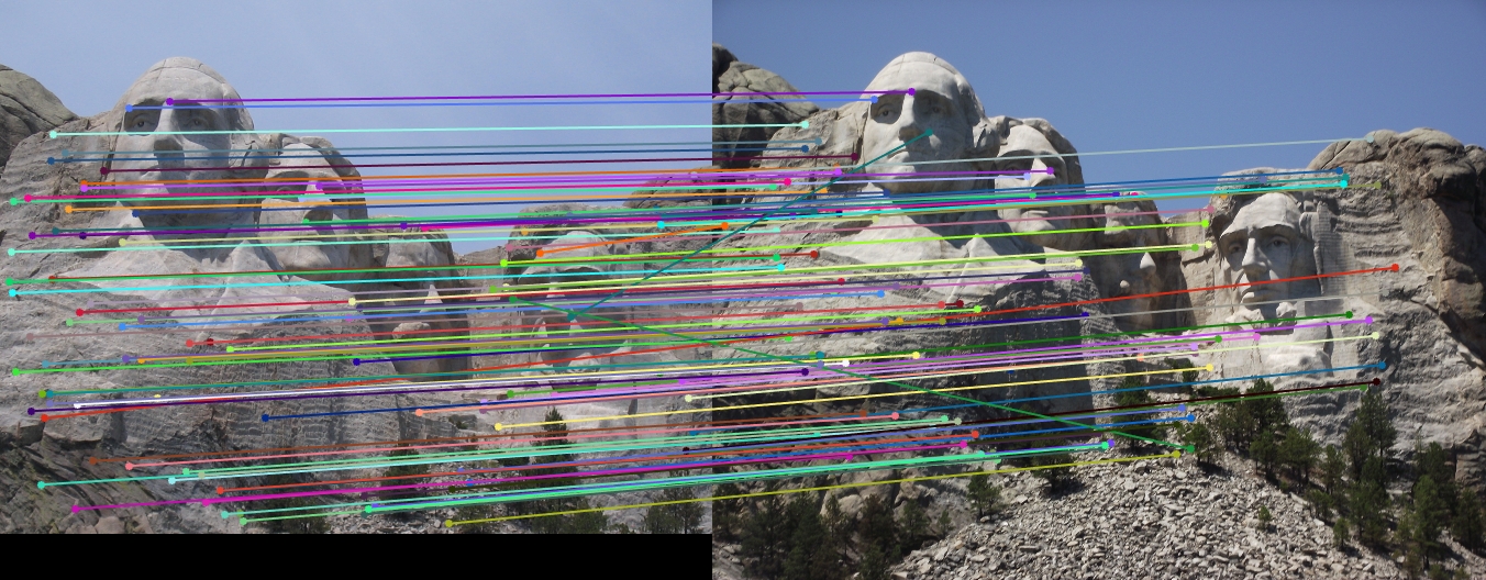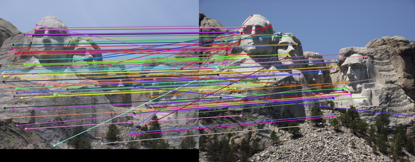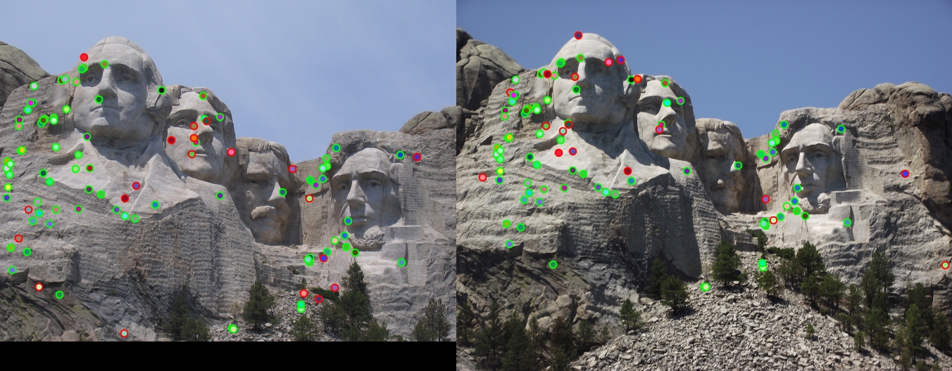 From the lecture, I learned that a Gaussian filter can be used to blur the image to reduce the effect of high frequency edges before implementing the SIFT algorithm. However, it was not particularly useful for both the Notre Dame and Mount Rushmore image pairs. Therefore, the image blurring was not implemented in my get_features.m file. For both images, descriptors using the normalized patch led to worse performance than the SIFT descriptors. However, I was able to achieve above 80% matching accuracy for both image pairs using both normalized patch descriptor and SIFT descriptor.