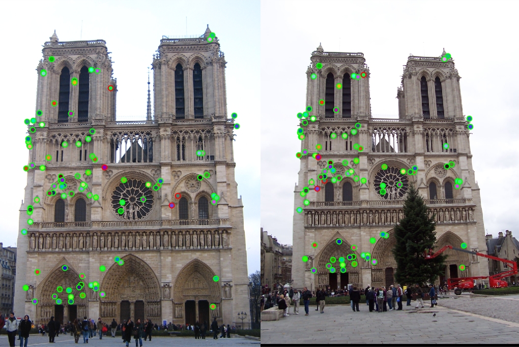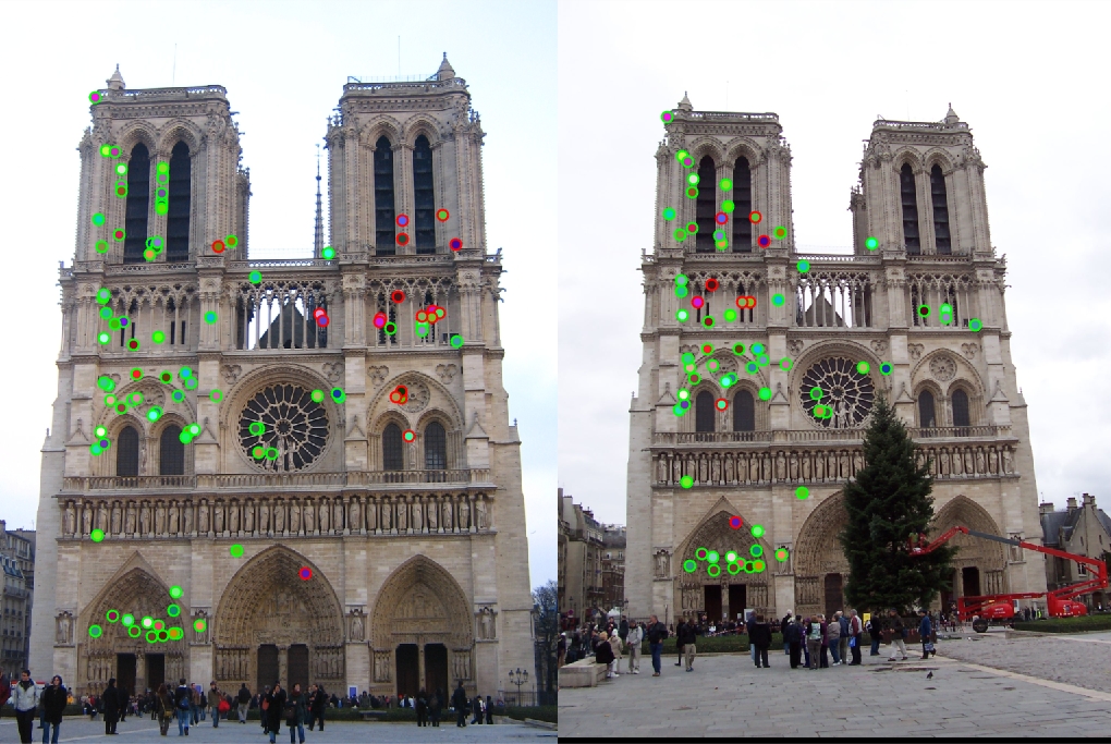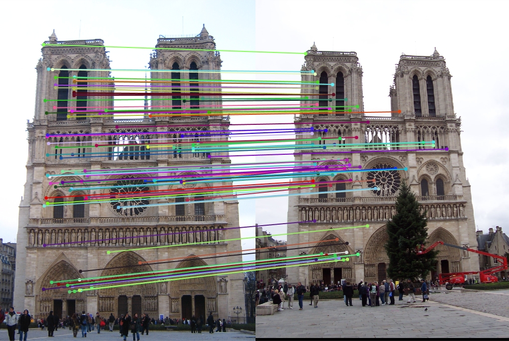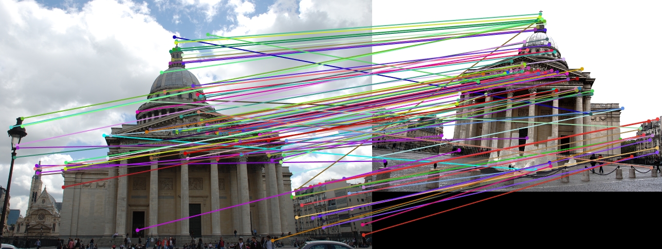 For the Notre Dame image pair, the threshold I used for the cornerness function had to be increased to ~9.99x10^-7 in order to accept enough interest points and for the matching accuracy of the first 100 confident matches to reach 94%. Alpha in the cornerness function was tested and eventually settled at 0.06. Lower values only reduces the accuracy. For the Mount Rushmore image pair, the threshold I set for the cornerness function was one order of magnitude lower than that for the Notre Dame image pair. Any higher threshold led to too few matches or a match accuracy of lower than 80%. Alpha in the cornerness function also had to be reduced to 0.02 for the best results, compared to the Notre Dame image pair. For the pantheon paris image pair, there is no ground truth to compare my results with and hence a lack of accuracy evaluation. However, it can be observed that SIFT descriptor significantly improved the number of matching features between the image pair compared to the normalized patch descriptor.