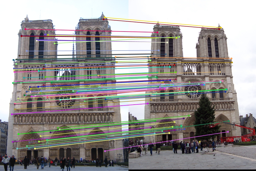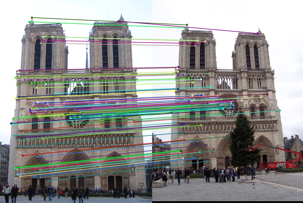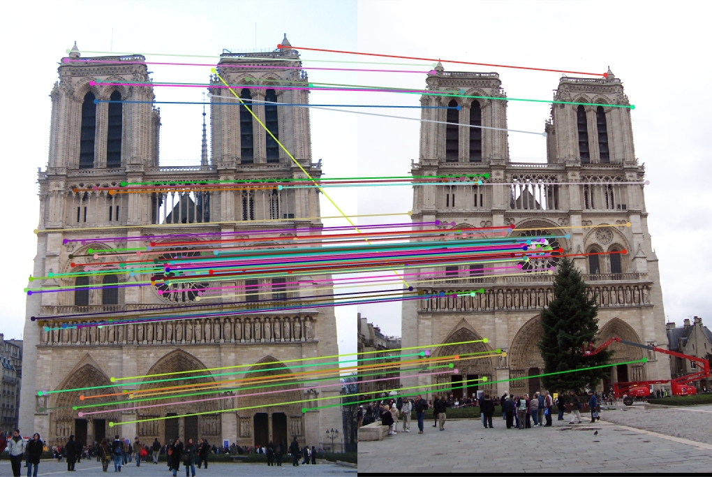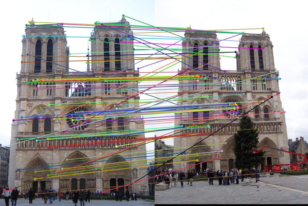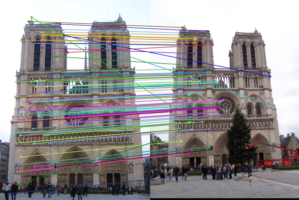 The distance between each feature from the image pair was computed by taking the norm of the feature descriptors. The ratio test was then implemented to determine the ratio between the first closest neighbor and the second closest neighbor distance and a threshold was set for the ratio. The feature pair that passes the threshold was considered a match with the confidence value of (1-ratio). The first 100 most confident feature pairs are displayed in the results below.