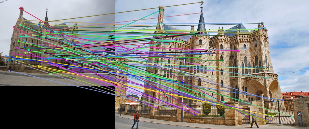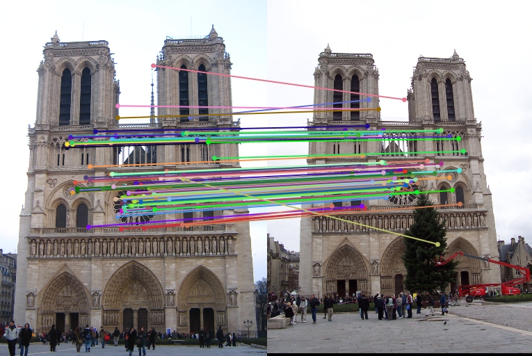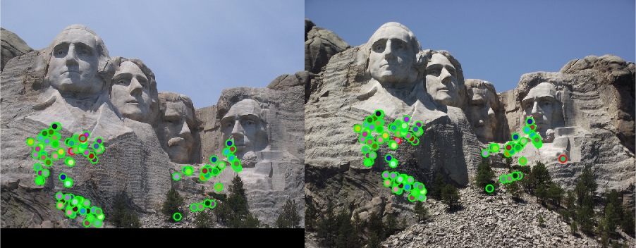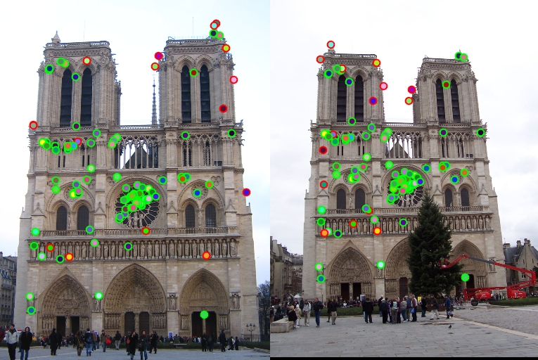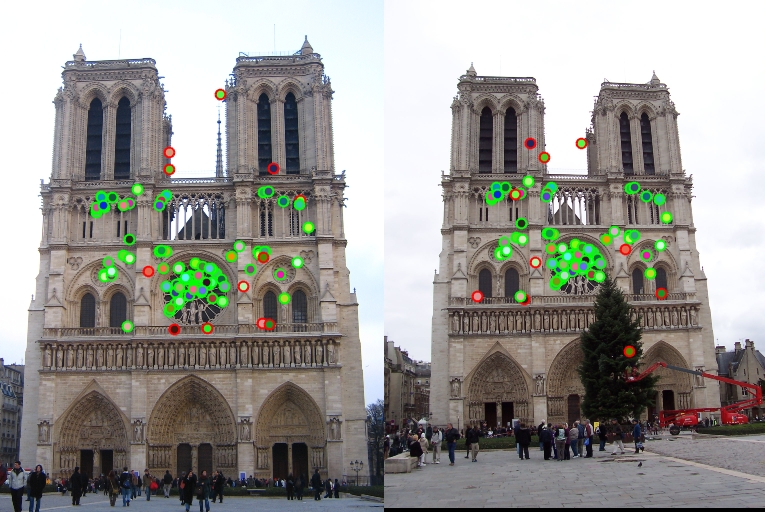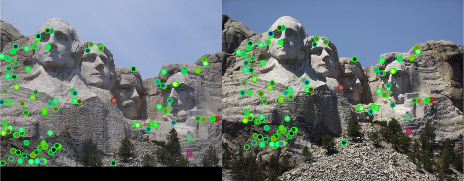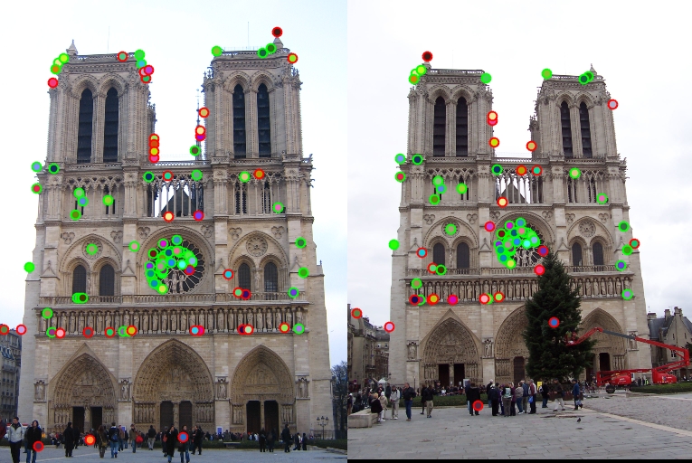 The image matches for Notre Dame (64%, 84%, and 88%), Mt Rushmore (97% and 98%), and Episcopal Gaudi (4% and 5%) are shown below. The results can be found in the Results folder. From the list of results above, it seems that using R values as the basis of comparison for finding local maxima works better for Mt Rushmore and Episcopal Gaudi, while using the image values works better for Notre Dame.