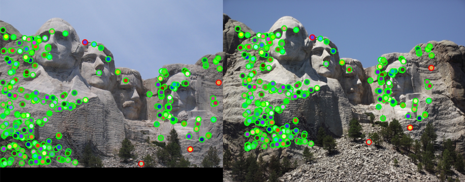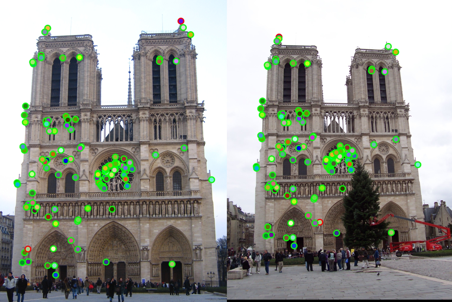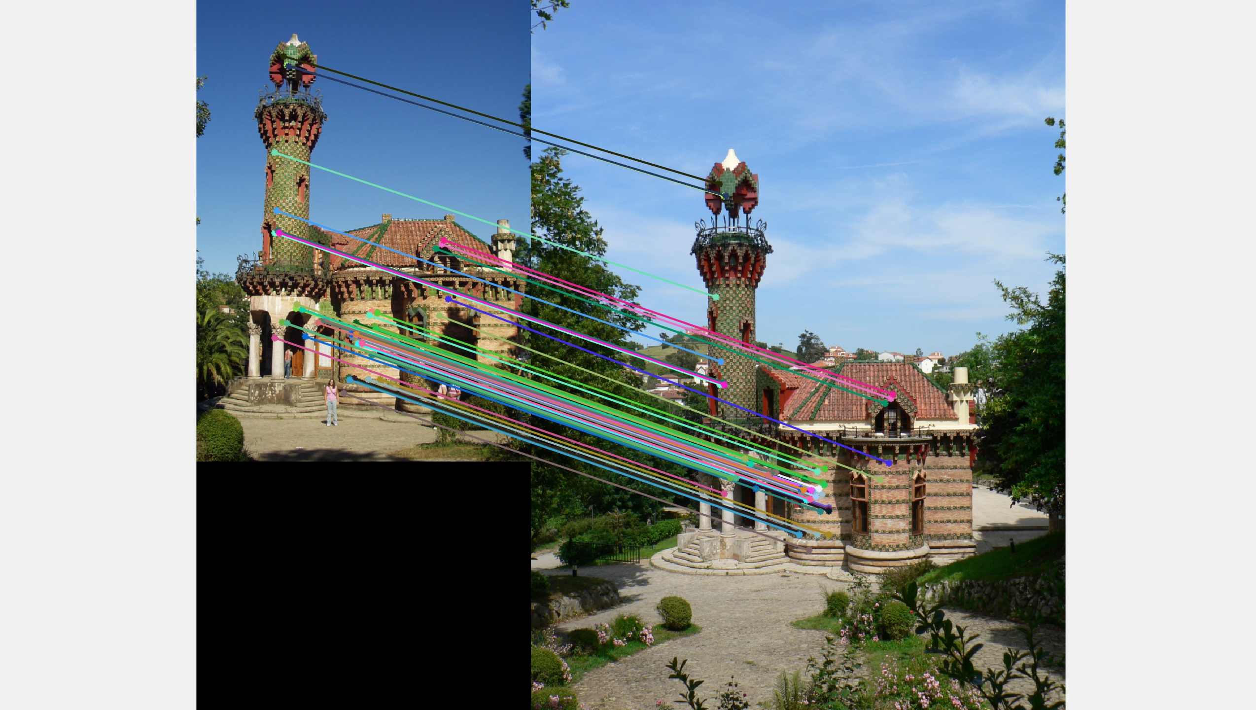My SIFT algorithm worked really well with most of the images as seen already. But when I ran it on the Episcopal Gaudi pair, it failed to even detect interest points. Reason for this I think is the intensity of the images. Since SIFT is not really invariant to intensity of the images, it would fail to produce accurate results.