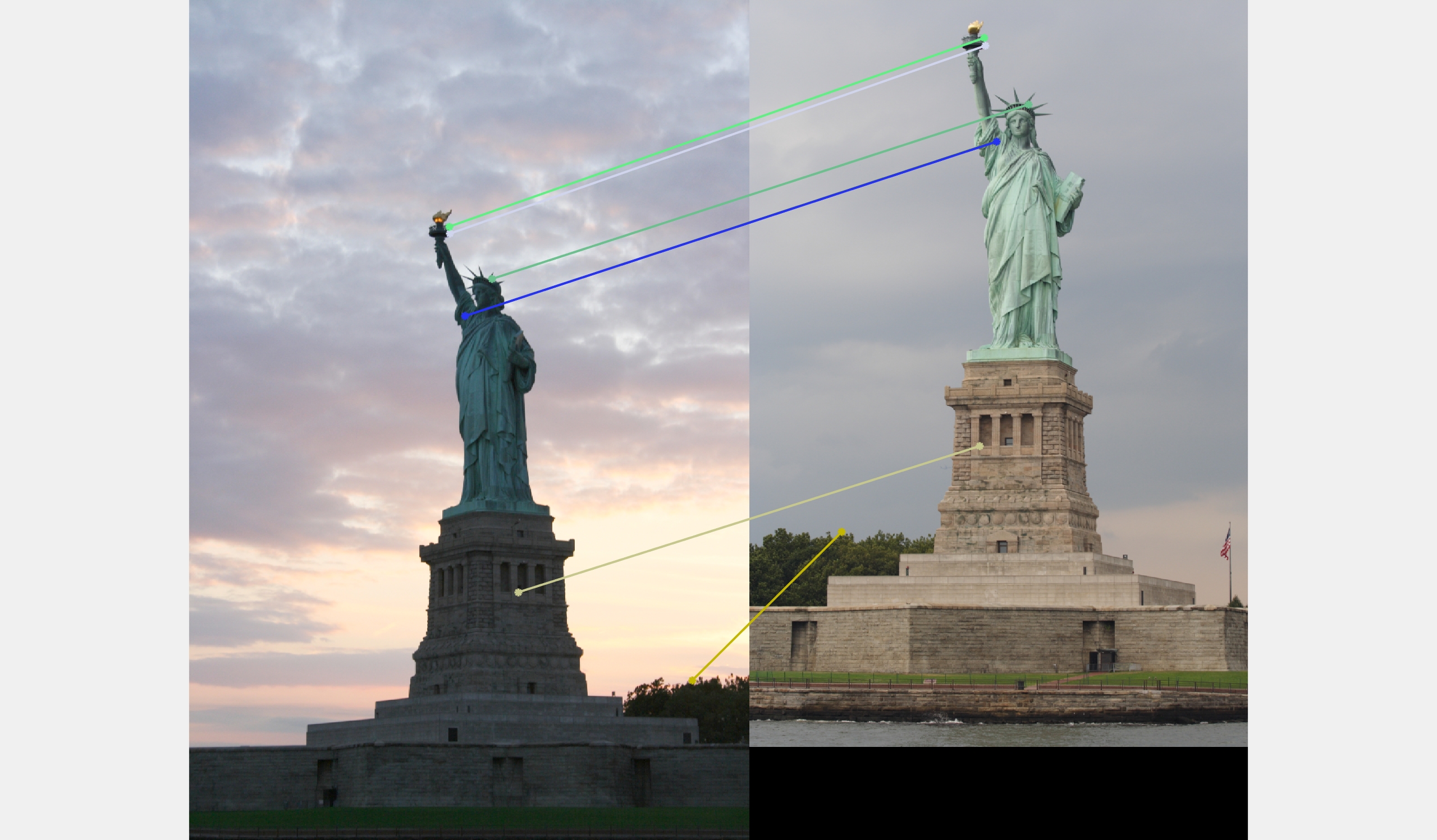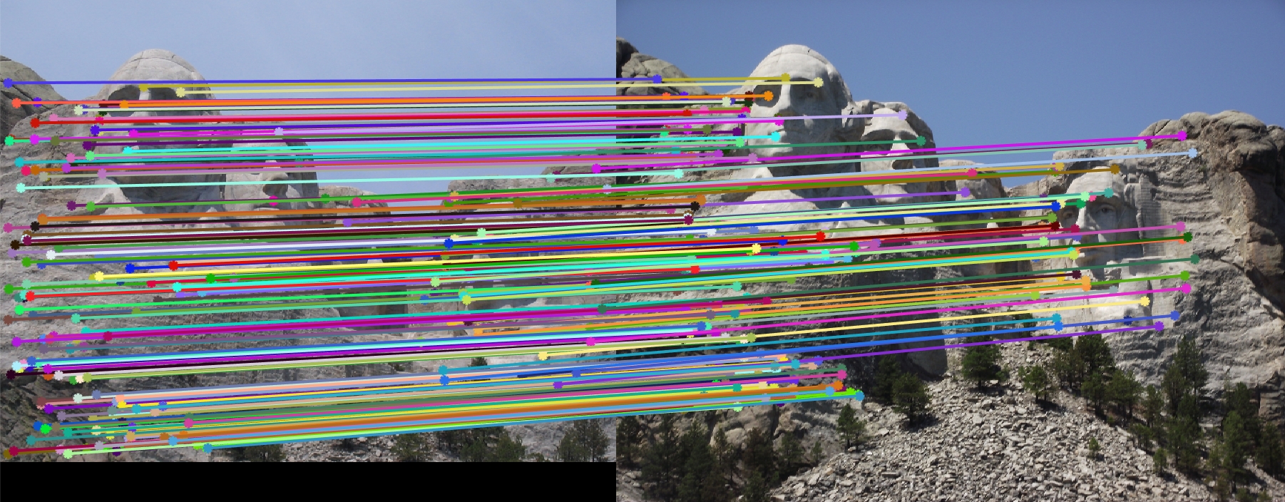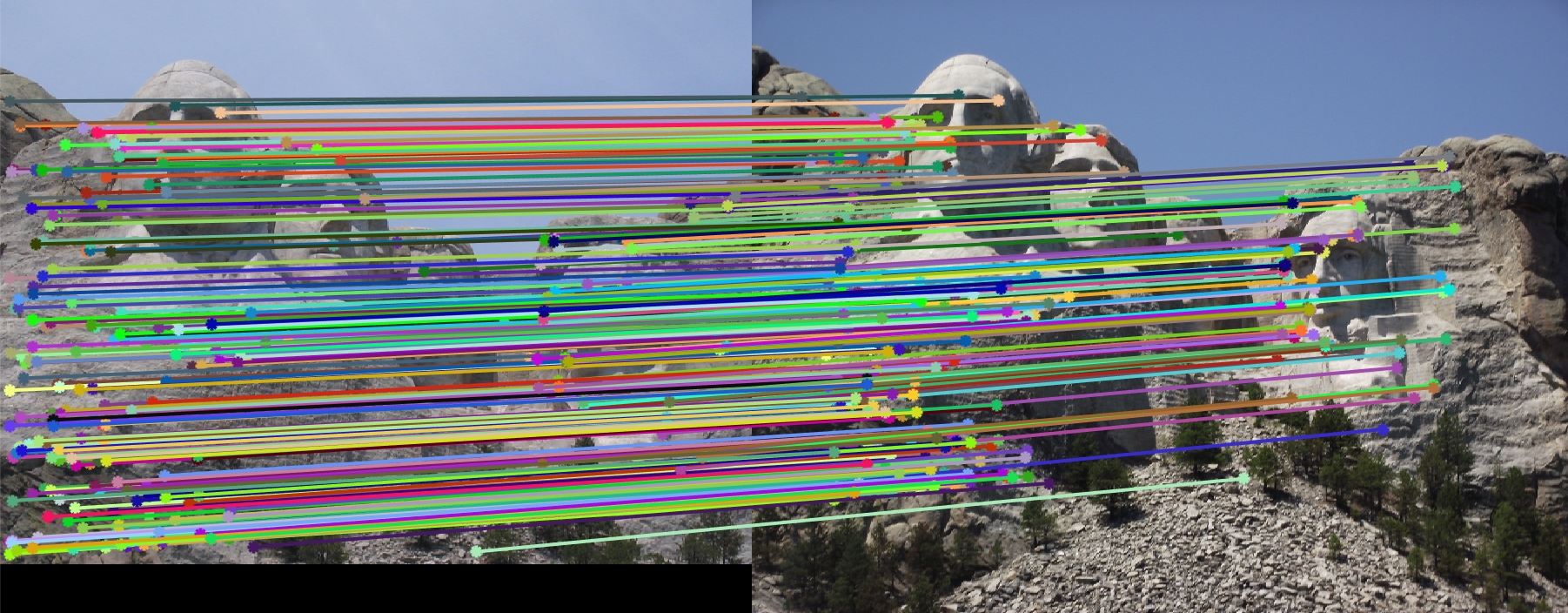 My SIFT algorithm worked really well with most of the images as seen already. But when I ran it on the Episcopal Gaudi pair, it failed to even detect interest points. Reason for this I think is the intensity of the images. Since SIFT is not really invariant to intensity of the images, it would fail to produce accurate results.