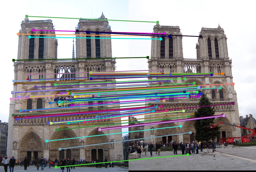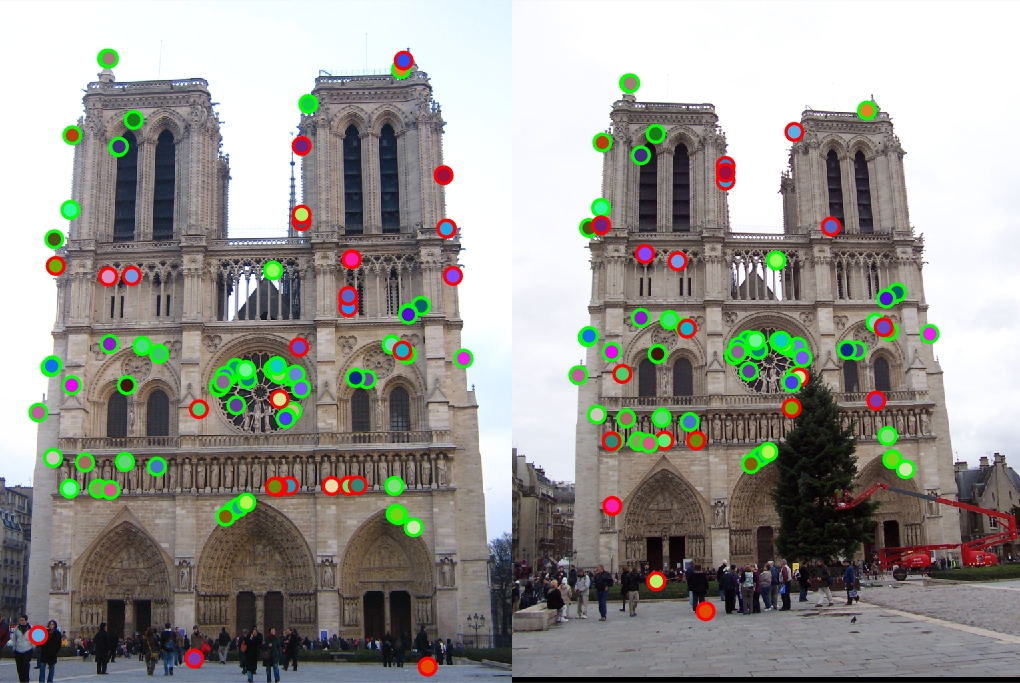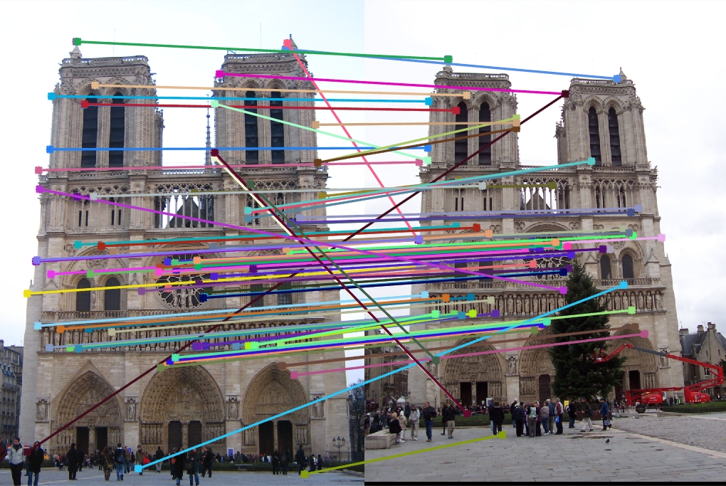 The feature descriptor we described in above step can directly be used for the local feature matching purpose. The euclidean distance the features are calculated and the two features which have minimum distance can be safely classified as matched features.