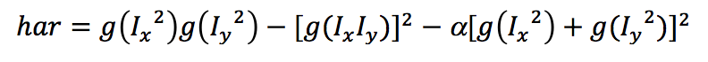 Then, three images - Ix*Ix, Ix*Iy, Iy*Iy - are required to be calculated. After this step, each of these images are needed to be convolved with a larger Gaussian to get g(Ix*Ix),g(Ix*Iy), g(Iy*Iy). In the fourth step, we need to compute a scalar interest measure using this equation: