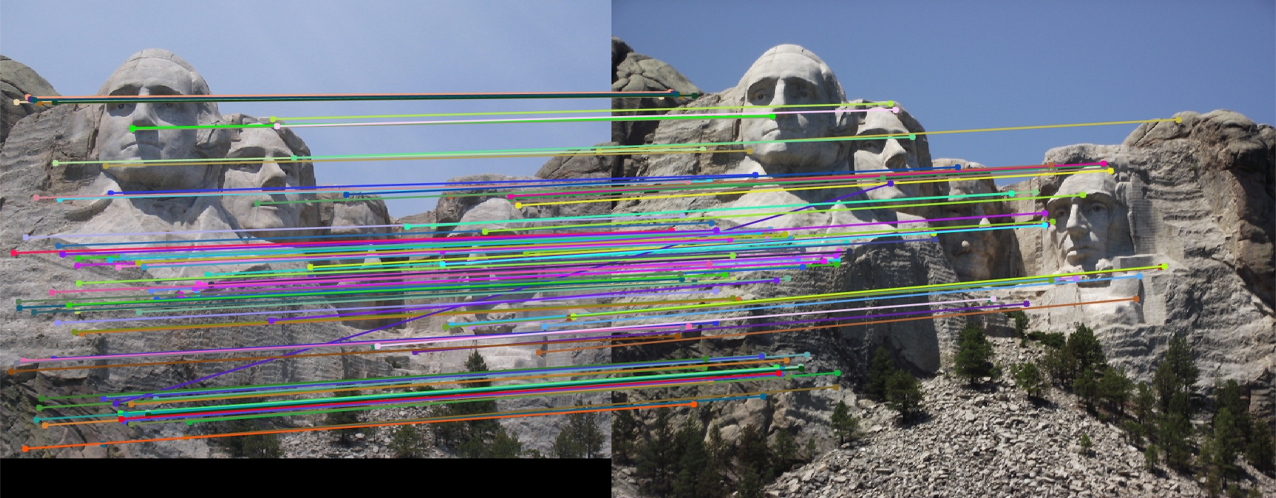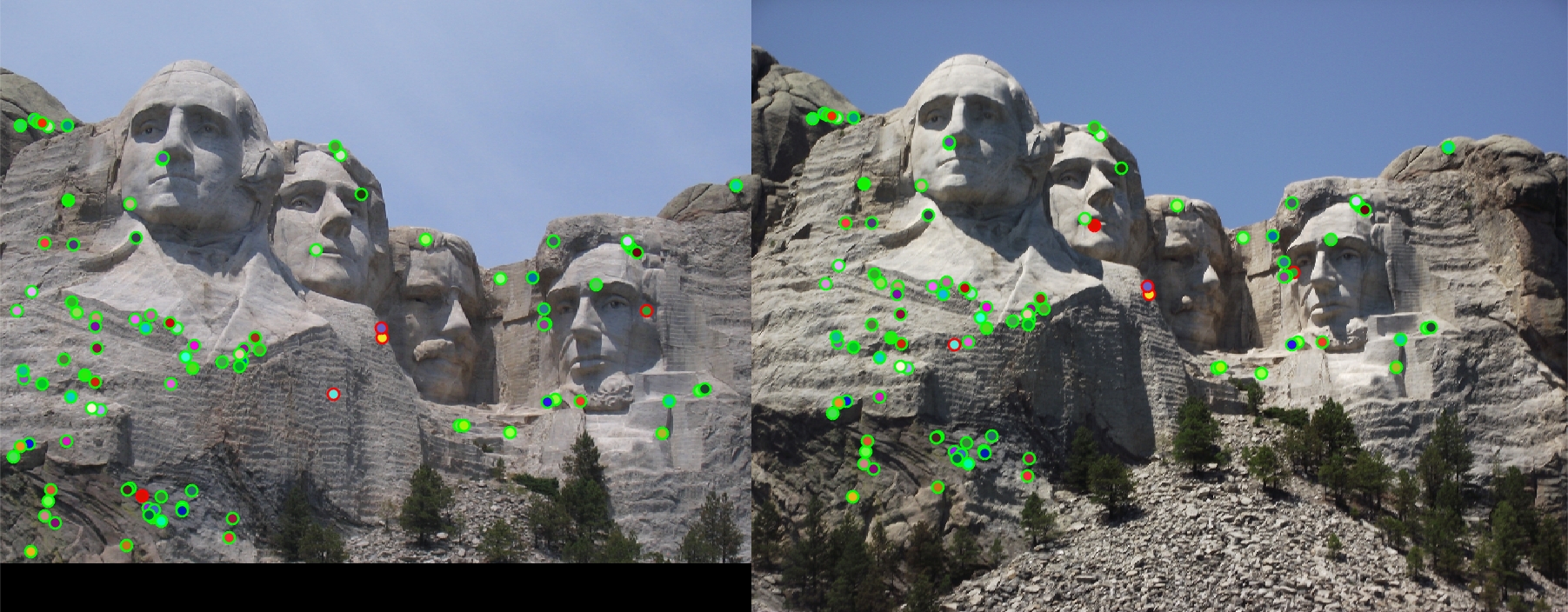Working on a pair of images showing Mt. Rushmore, the program still does very well using SIFT features and the ratio test, giving a 95% accuracy for the 100 most confident matches. Given that the scale of both images is similar, using Harris corners and then SIFT-like descriptors still provides a good way to find matches.