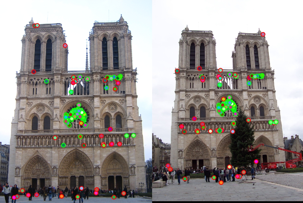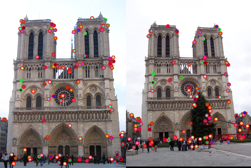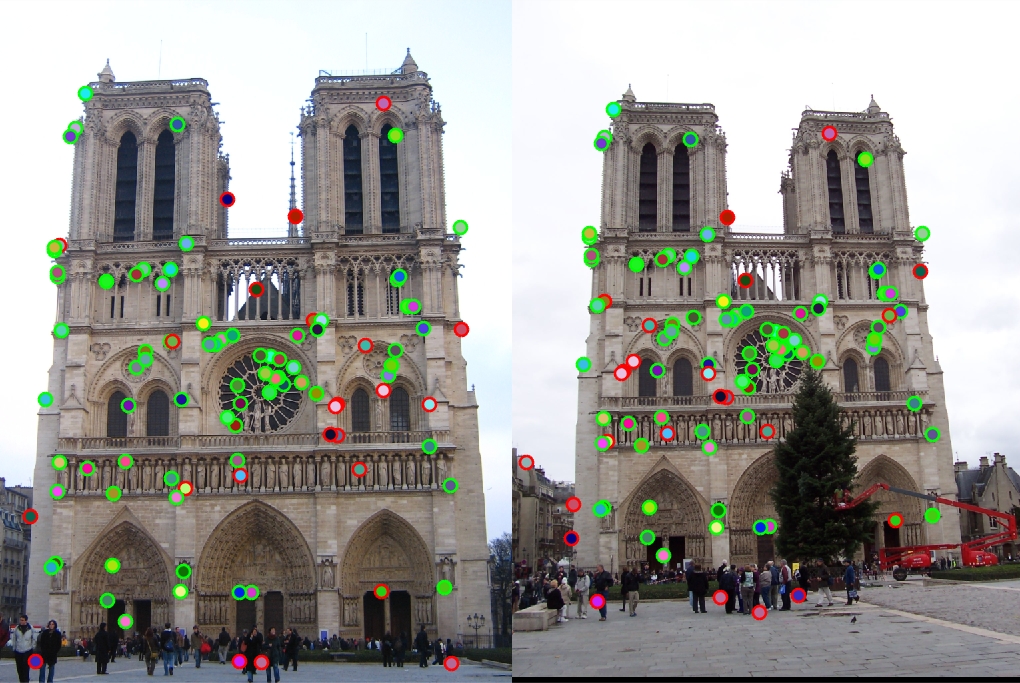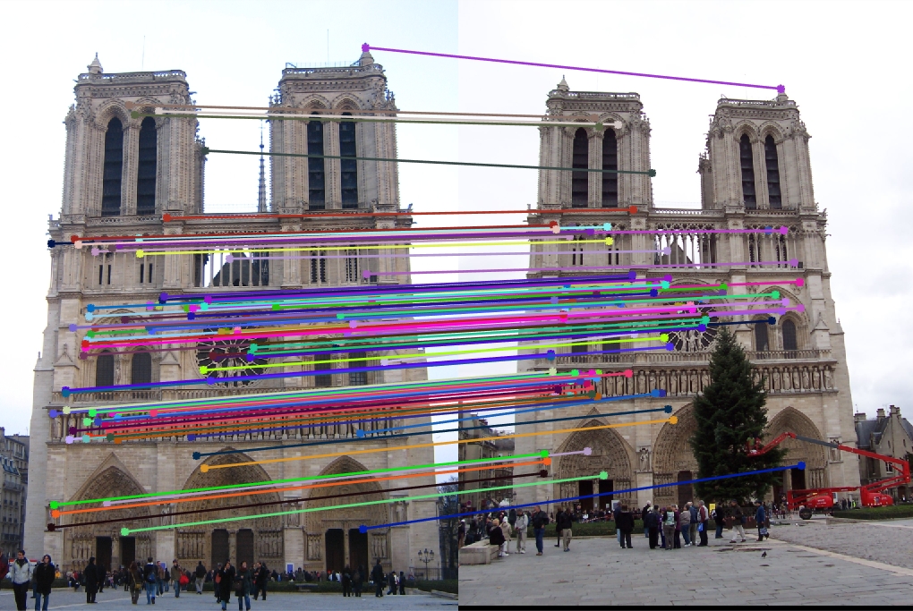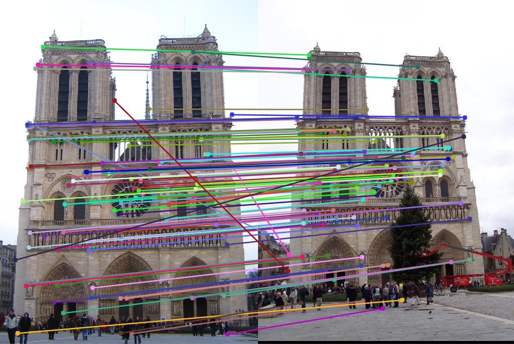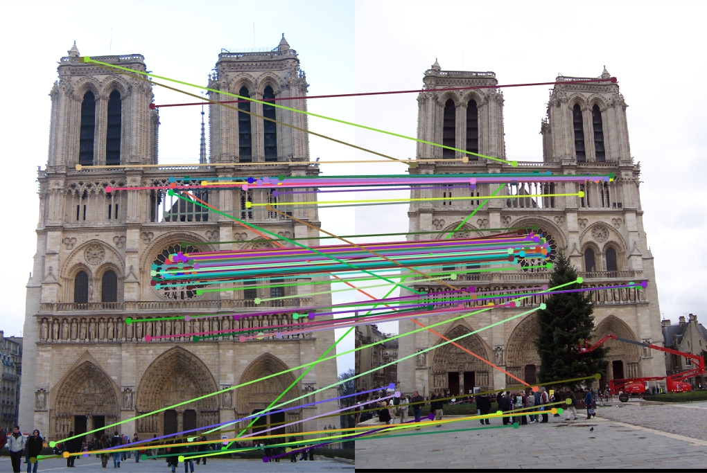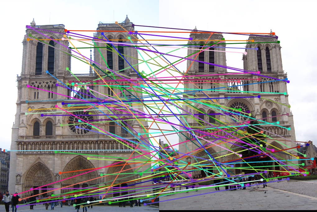 This time, only a 7% match accuracy was seen. This is due to the SIFT-like descriptor being more abstract than a normalized patch in regards to the actual pixel values of the image. Therefore, it is more difficult to match up keypoints than when using normalized patches, since there is less data about the actual image. Further work has to be done to throw out ambiguous matches, even though their distance may be very small.