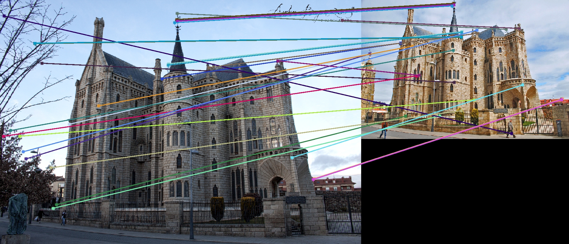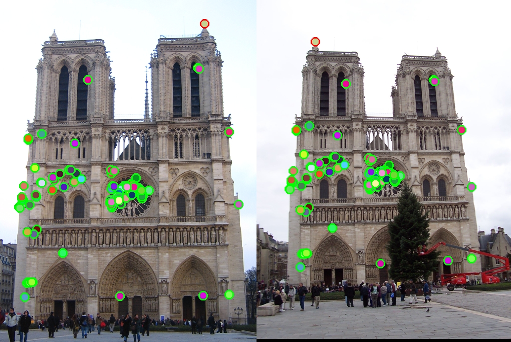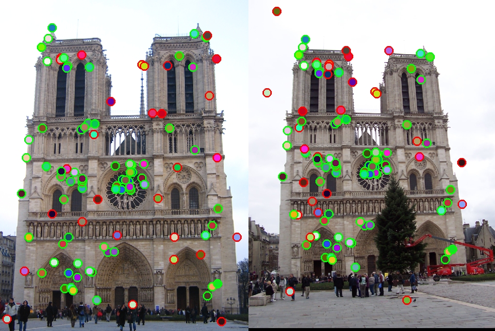 As shown above, the Notre Dame and Mount Rushmore test cases perform quite well with very high accuracy. The Episcopal Gaudi case does not perform nearly as well because of the different scales. To show this, we present some alternative sets of Episcopal Gaudi images below with similar scales.