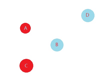In this implementation, a two-sided ratio test is used. Instead of only one point having to check the ratio against its nearest and second nearest neighbour, we require its nearest neighbour to also pass the ratio test against our original point as its nearest neighbour. To see why this can be helpful, consider the case shown in the figure on the right. In this case, a one-sided ratio test would match point A to point B because |AB|/|AD| is sufficiently small. For point B however, the situation is ambiguous because point A and point C are of the same distance to B. Hence by checking the ratio test from both sides, we can eliminate many potentially bad matches. The table below shows the improvement this match scheme brings to an earlier version of the implementation.
