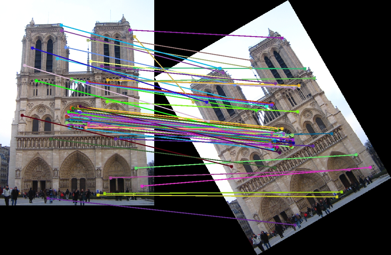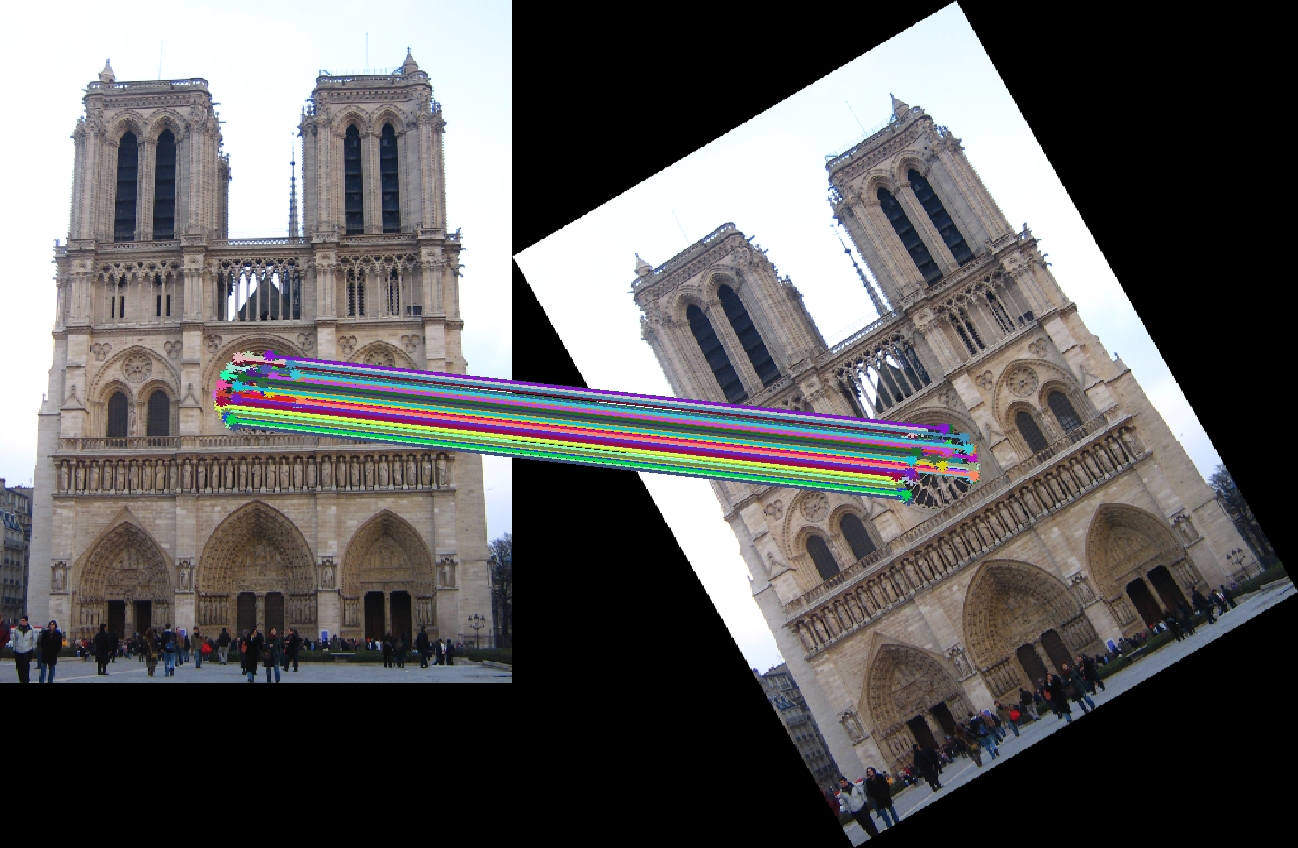 The above two images shows the result of match between a rotated set of Notre Dame without and with orientation estimate/descriptor respectively. In the default baseline result, it is only able to find matches in the center area, where the image is rotationally symmetric. With a rotation invariant feature descriptor, the program was able to find more interesting matches in other regions of the image.