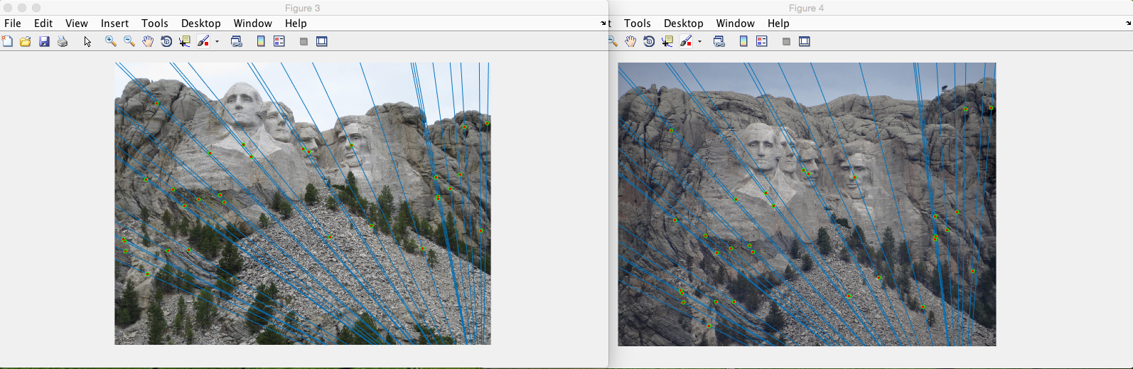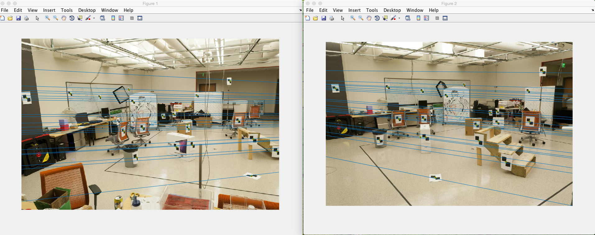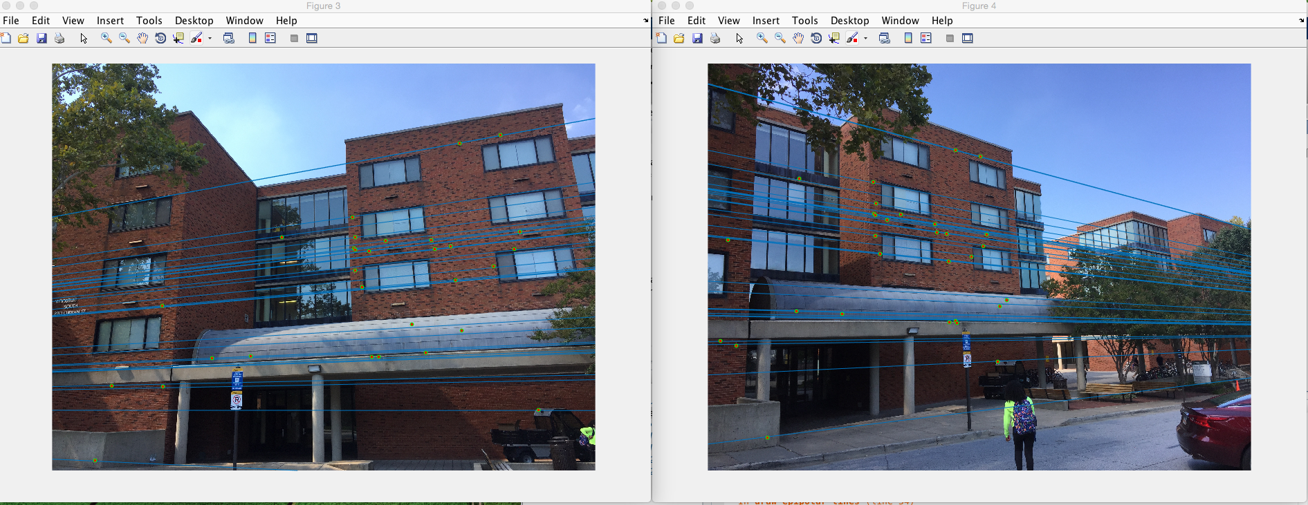 The epipolar lines in each image computed from the fundamental matrix can be visualized as follows: