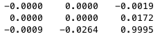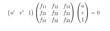 These equations were solved for every pair of corresponding points. After solving for the f values and making the matrix rank 2, the resulting fundamental matrix for a sample pair of images was: