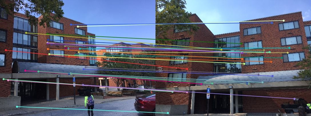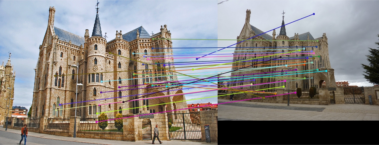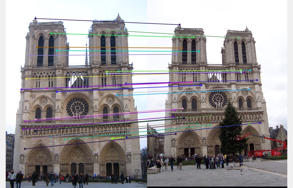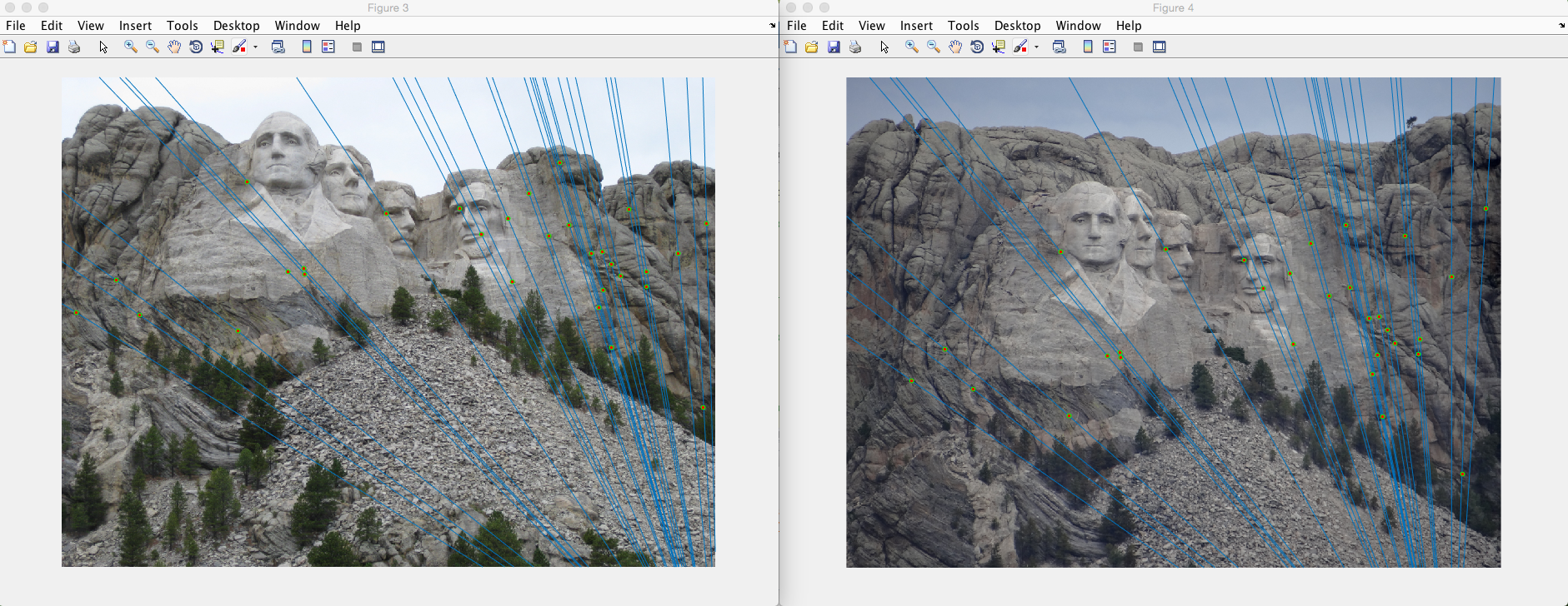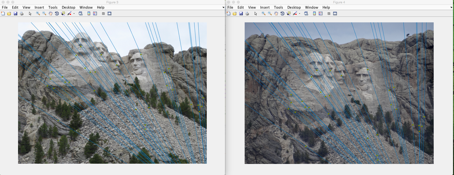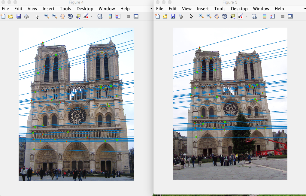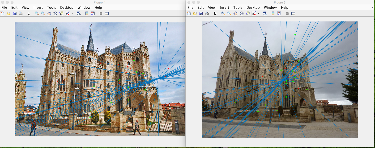 Here are the resulting epipolar lines and correspondences for the fundamental matrices for many image pairs. Good epipolar lines were yielded for all pairs except for the Gaudi pair since the eight-point algorithm was not normalized.