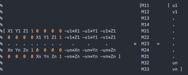 In order to find the values in the matrix M, I had to set up a series of equations in MATLAB which took into account several image-world correspondences: