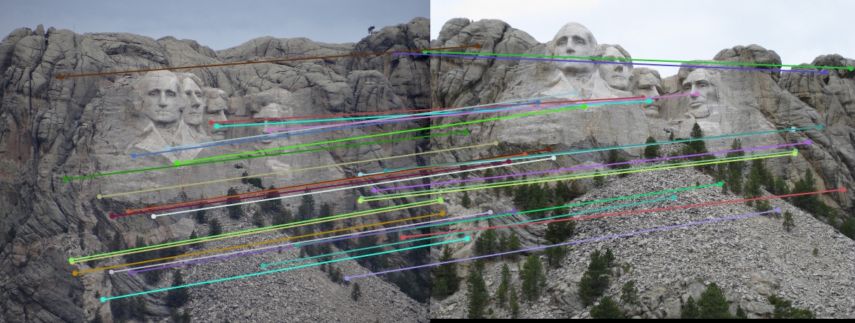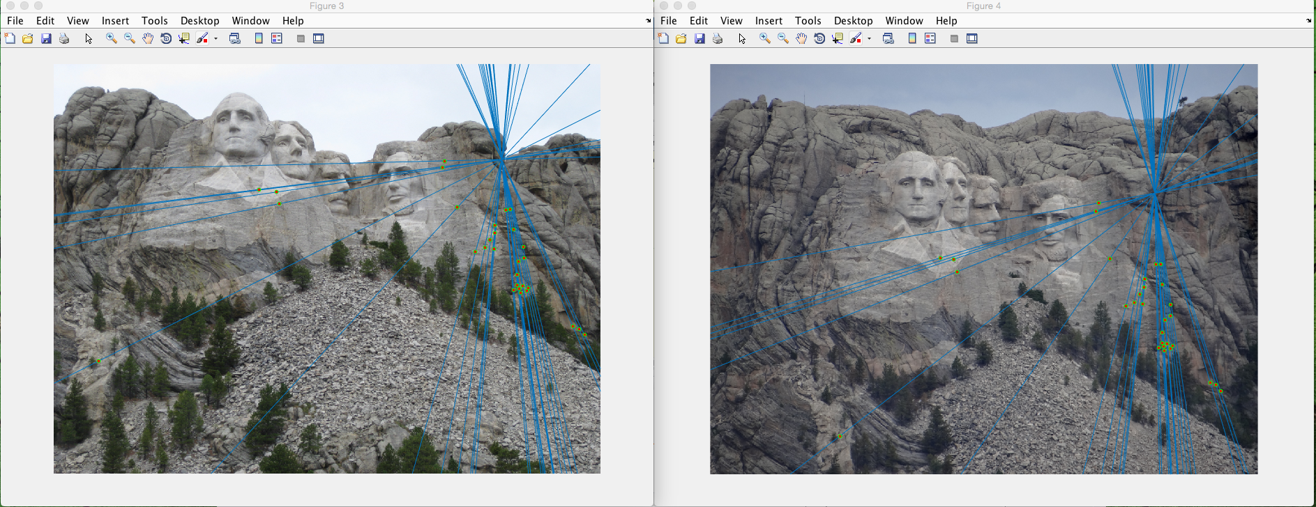 To find the best threshold, I used a Mount Rushmore image pair to perform trials for three thresholds: 0.002, 0.01, and 0.02. About 825 possible keypoint matches were found. I anticipated that the threshold that resulted in a matrix that found close to half of those correspondences to be inliers would be a good threshold to use.