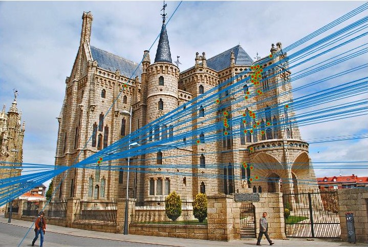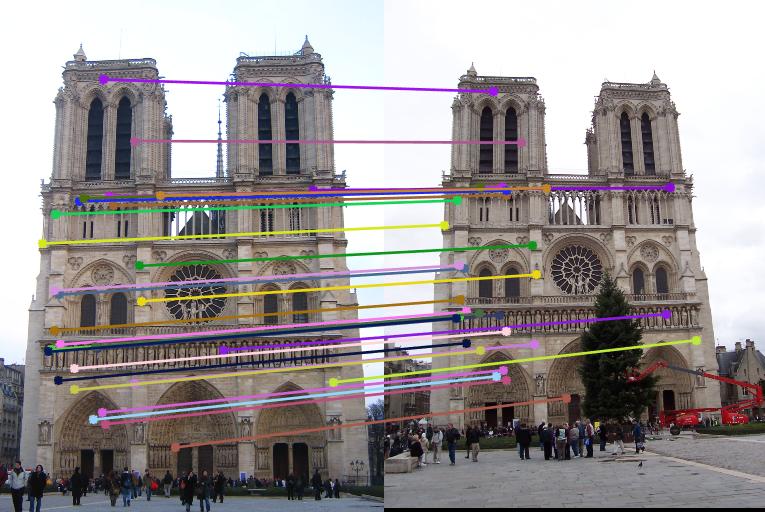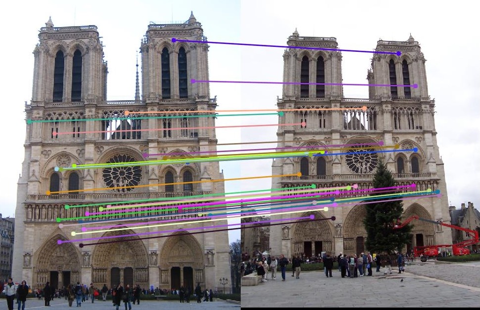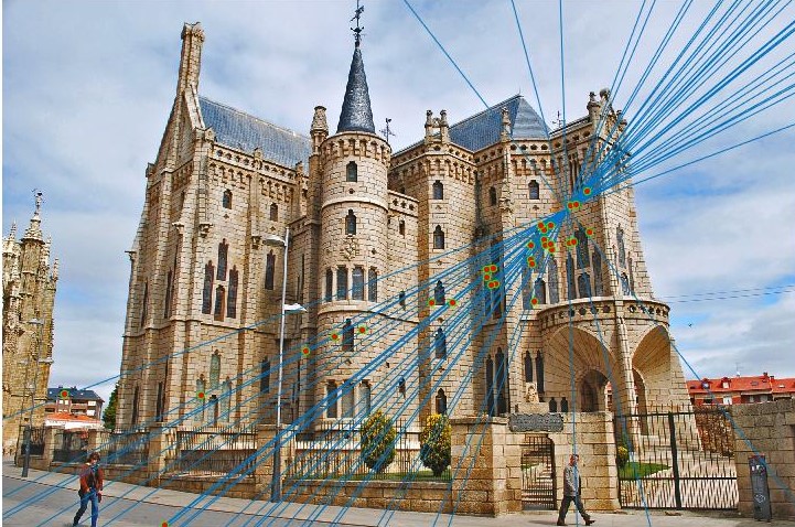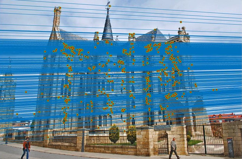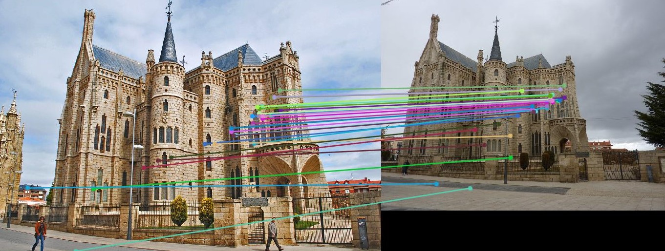 Image 1 showing the results of the correspondences before performing the RANSAC. Image 2 showing the results of the correspondences after performing the RANSAC. Only the top 30 matches are shown in this image. |