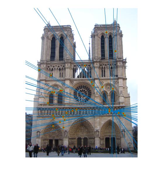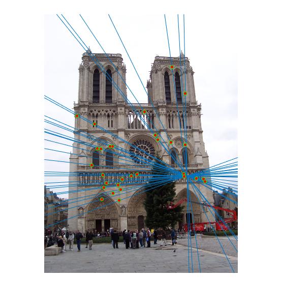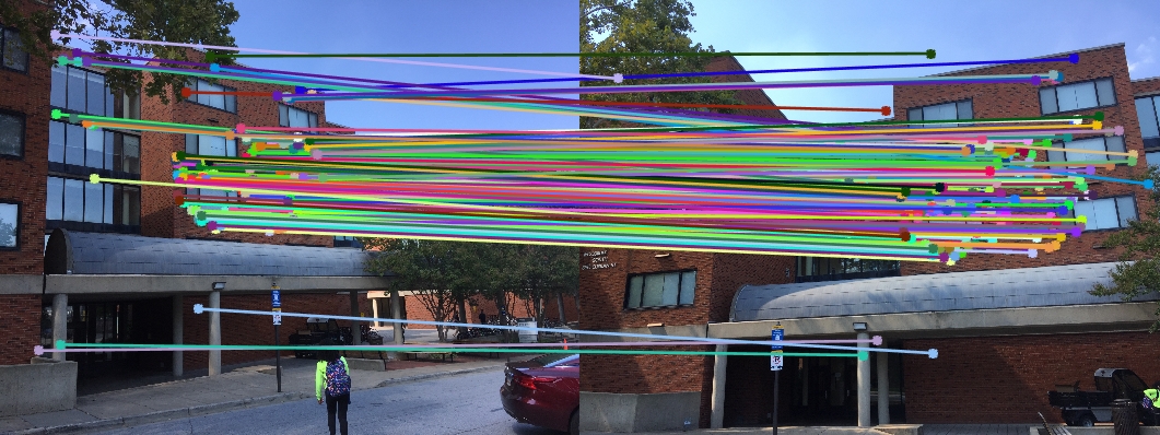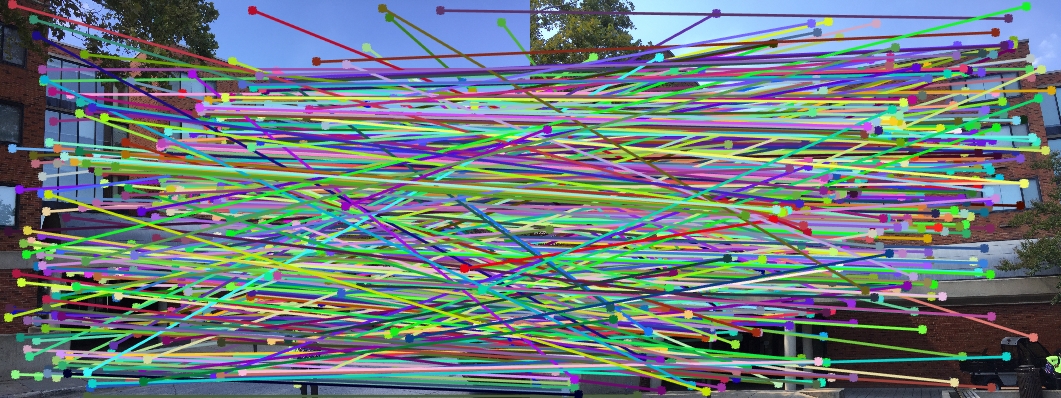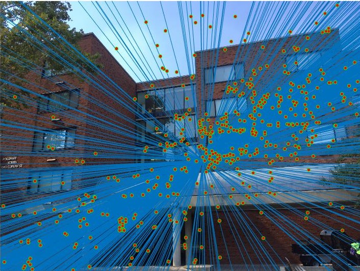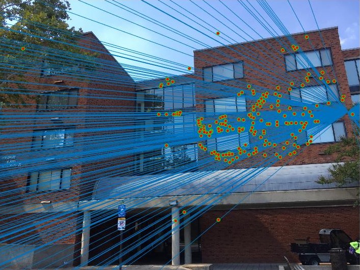 First, the SIFT features were computed for both the images. The points were first randomly SAMPLED and eight points were picked up to calculate the Fundamental Matrix. This was further used to calculate the number of inliers and the matrix which gave the maximum number of inliers was the best Fundamental Matrix, but this estimate can be wrong, as the points can be coplanar or because of lens distortions. But this matrix is the best in removing the incorrect SIFT matches. For calculating the inliers, we calculated the distance metric. We set a cut-off value and all the points with the value less than this value were considered as inliers. We used the Fundamental Matrix constraint as a distance metric. We can also use the Sampson Error for the distance metric which is used to compute the distance of a point correspondence to the corresponding epipolar line of the point correspondence in the other image.